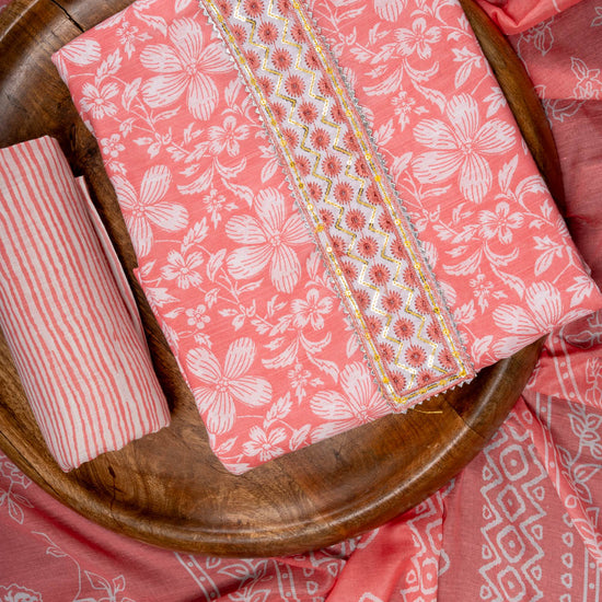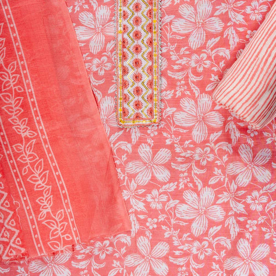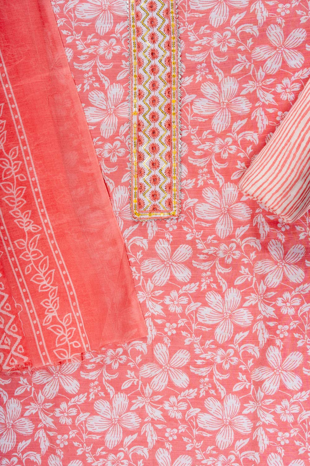 Coral Sequence, Threadwork & Floral Printed Cotton Unstitched Salwar Suit With Cotton Dupatta