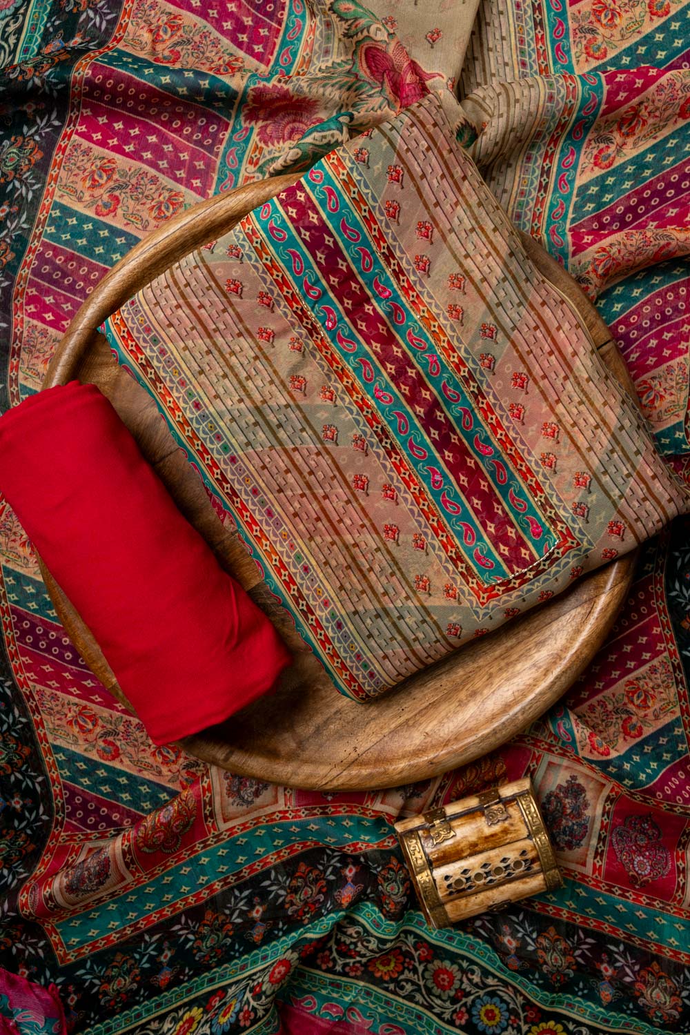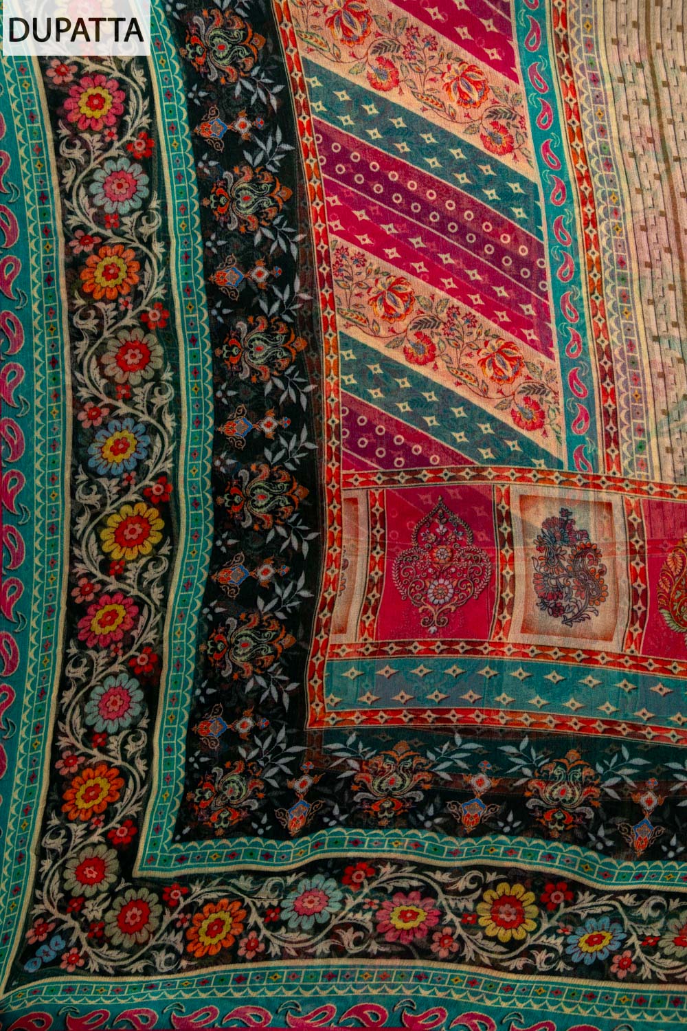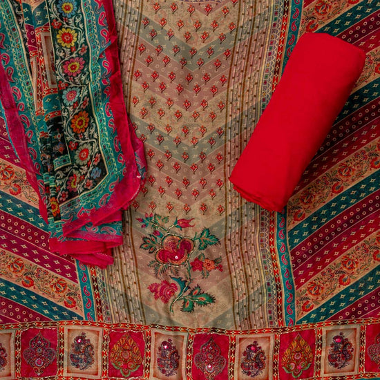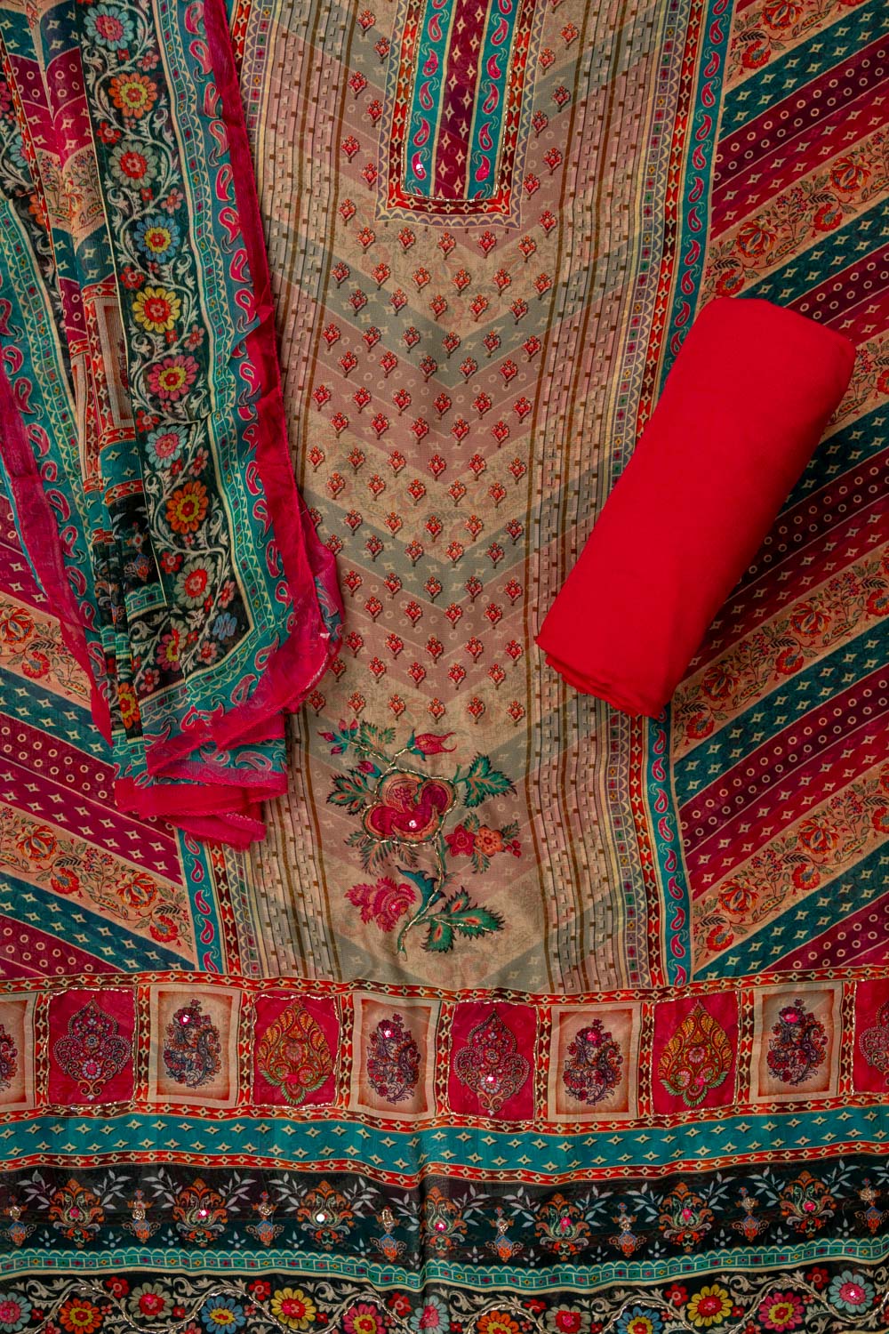 Panna Magenta Cutdana, Mirror Sheet, Threadwork & Digital Printed Organza Unstitched Salwar Suit With Chiffon Dupatta