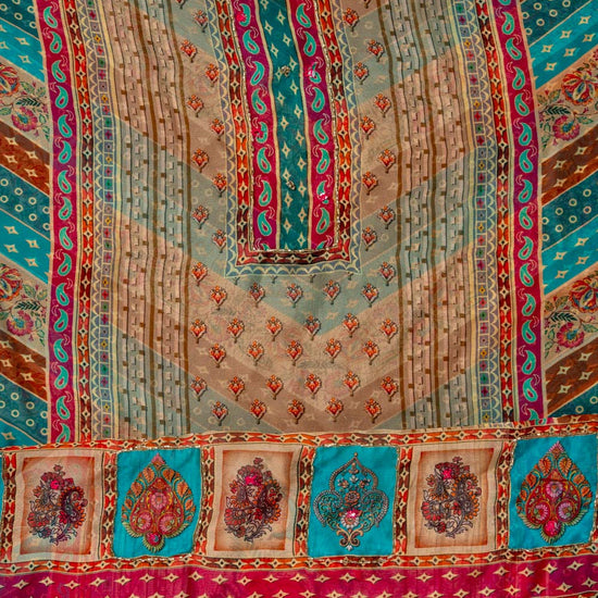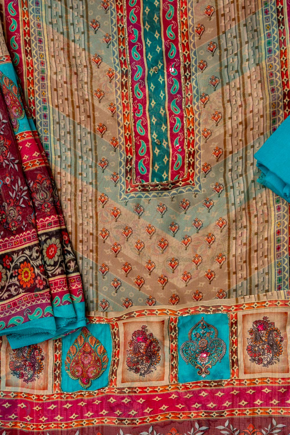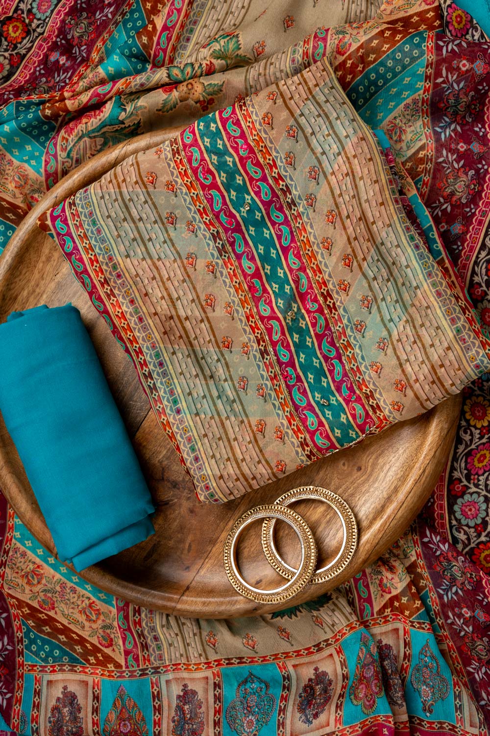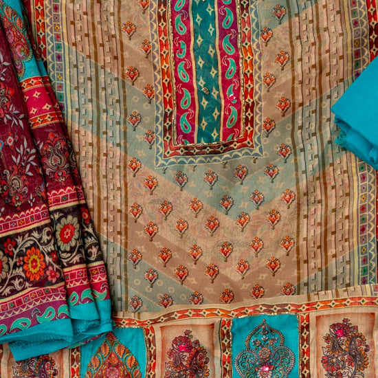 Panna Rama Cutdana, Mirror Sheet, Threadwork & Digital Printed Organza Unstitched Salwar Suit With Chiffon Dupatta
