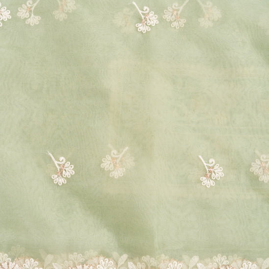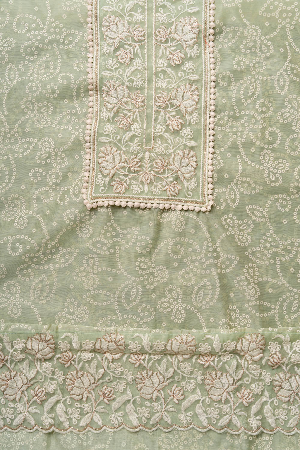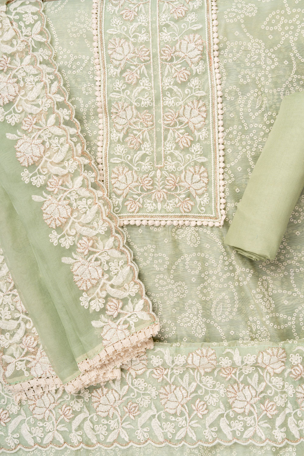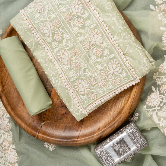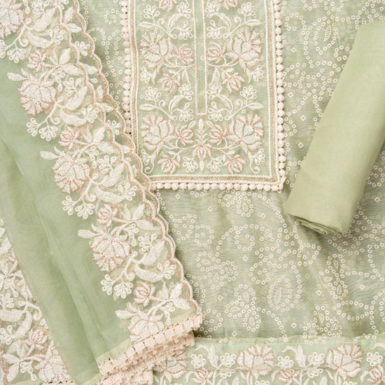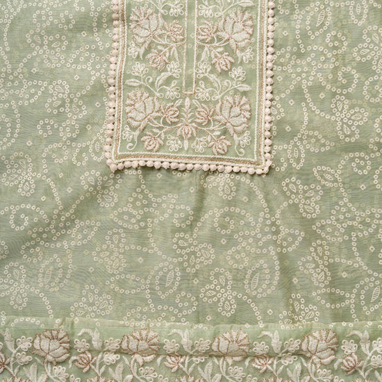 Panna Pista Sequence, Threadwork & Bandhini Printed Chanderi Cotton Unstitched Salwar Suit With Organza Dupatta