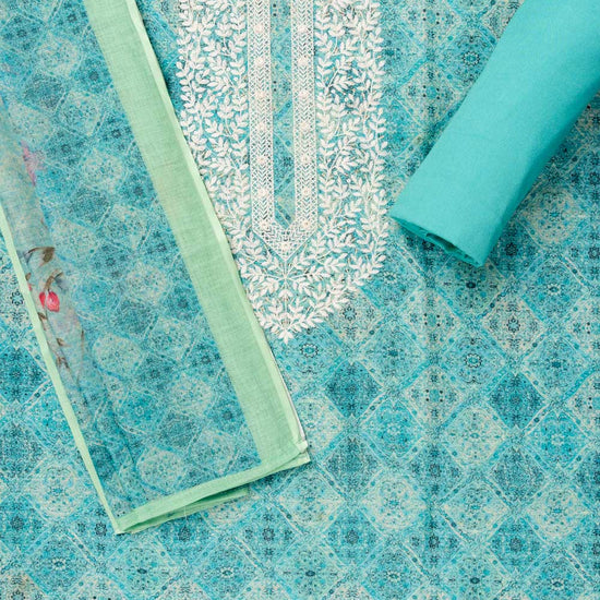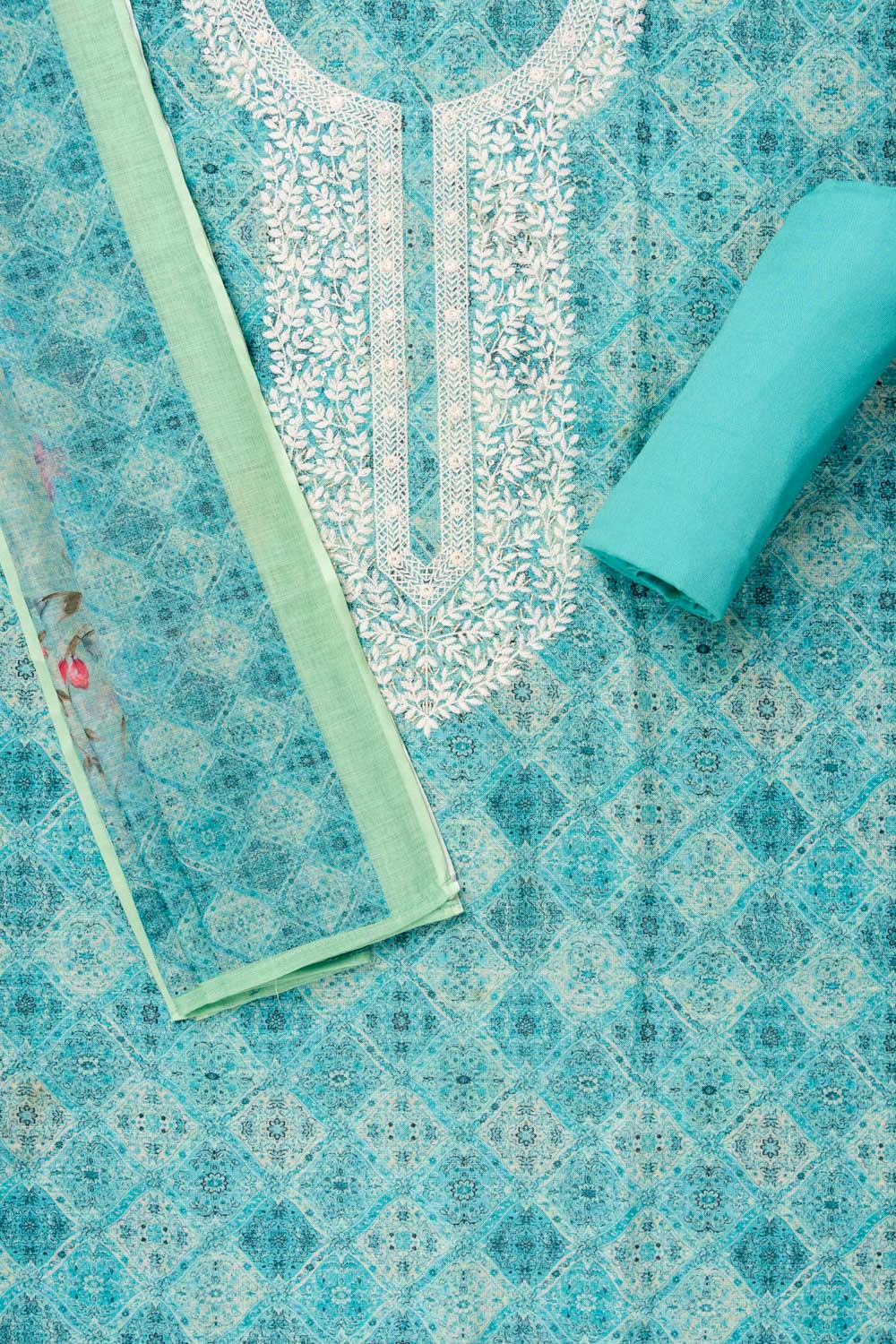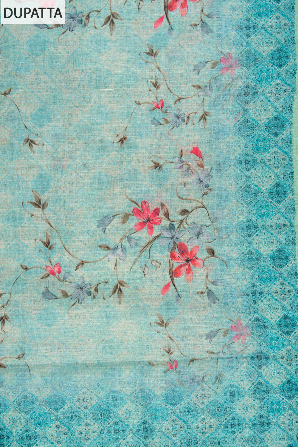Tea-green Sequence, Threadwork & Digital Printed Cotton Unstitched Salwar Suit With Cotton Dupatta