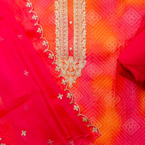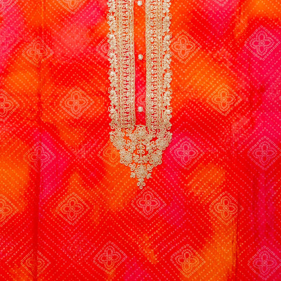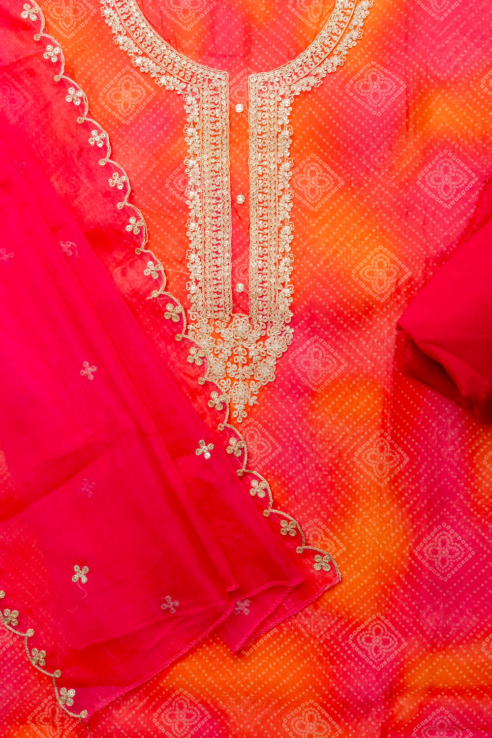 The suit features a vibrant Bandhani print, symbolizing rich Indian heritage, paired with delicate thread embroidery and shimmering sequin accents that add a subtle festive sparkle. The intricate detailing enhances the ensemble’s charm while keeping it sophisticated and refined.