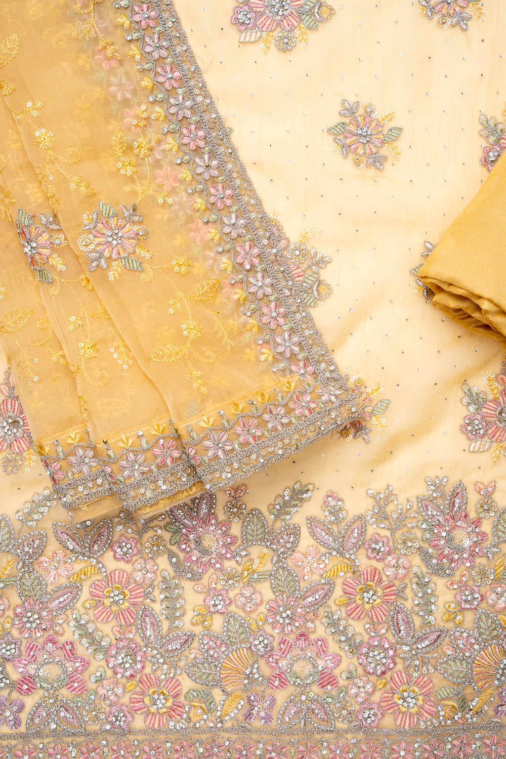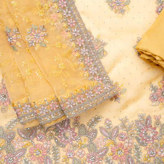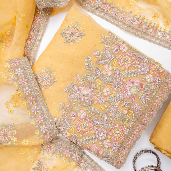 Panna Mango Gold Organza Unstitched Salwar Suit With Organza Dupatta