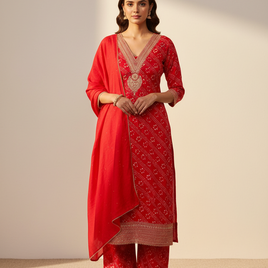 The suit is enhanced with Bandhni print, celebrating timeless Indian craftsmanship. Accented with delicate Sequence work and intricate Zari thread detailing, the suit radiates a subtle shimmer that enhances its charm. Ideal for daytime festivities