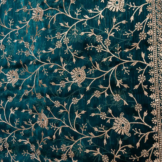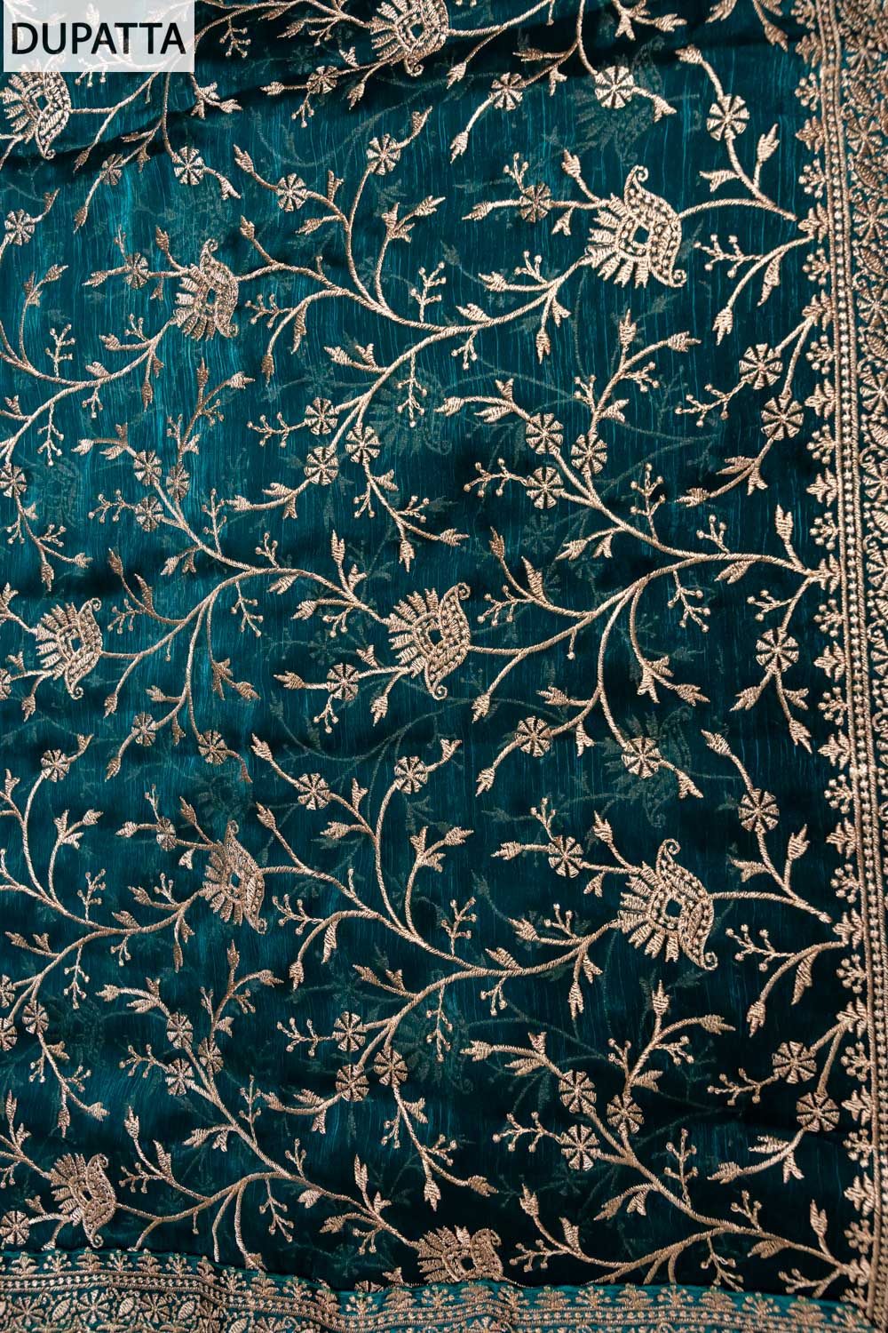 The suit is adorned with sparkling Swarovski embellishments, intricate zari thread embroidery, and delicate zarkan highlights, creating a subtle shimmer that catches every glance. Each detail reflects fine craftsmanship and adds a touch of sophistication to this classic ensemble.