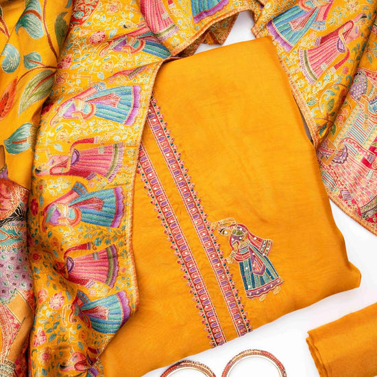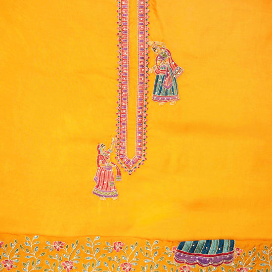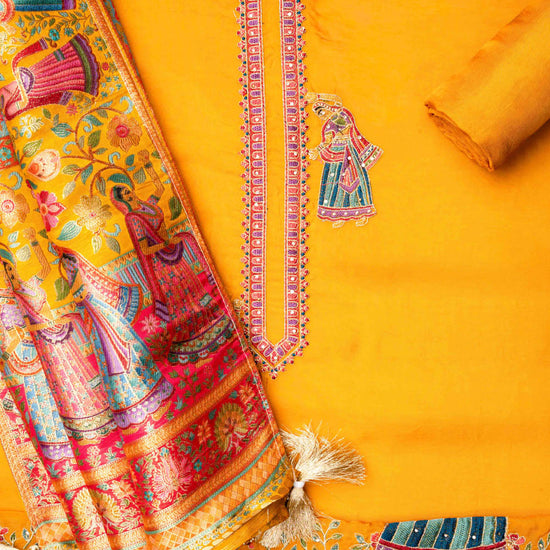 Panna Mustard Organza Unstitched Salwar Suit With Dola Silk Dupatta