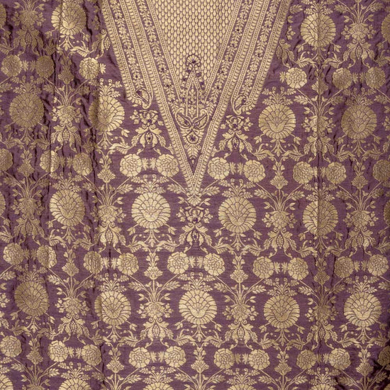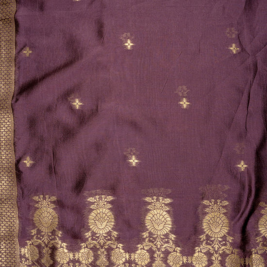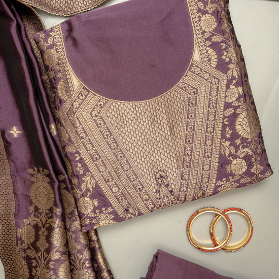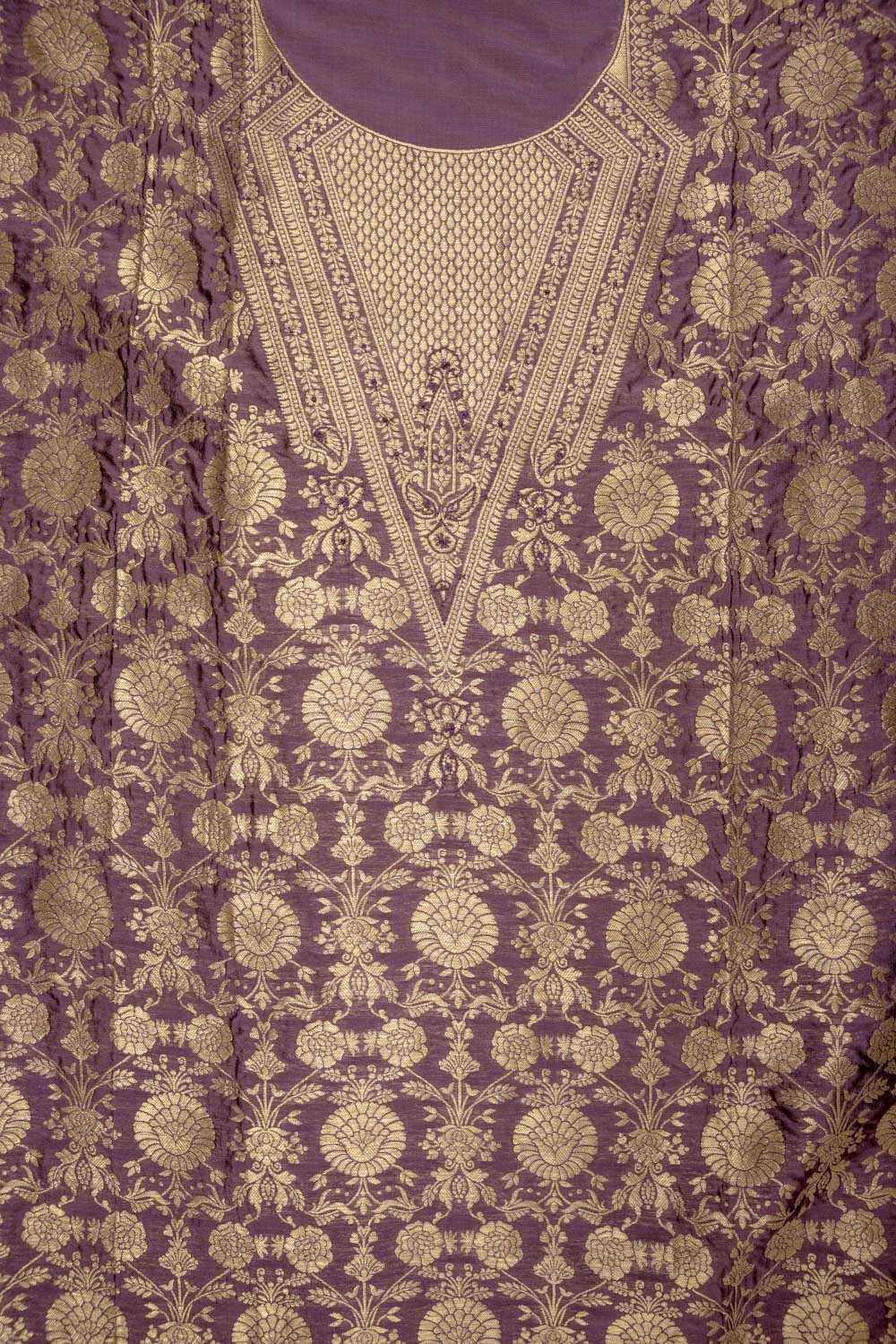 The ensemble is beautifully enhanced with intricate woven zari work, adding a regal touch of gold that complements the subtle shimmer of the fabric. The delicate zari motifs reflect traditional craftsmanship, making this outfit a perfect choice for those who love understated opulence.