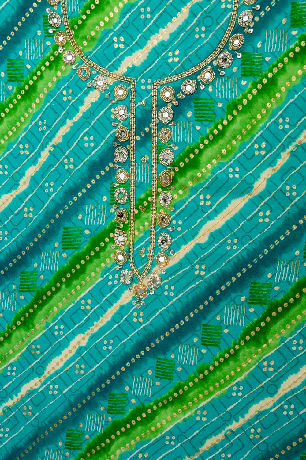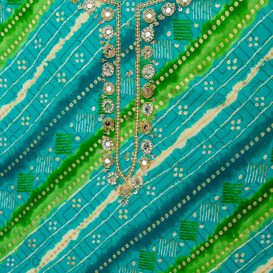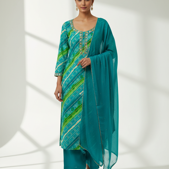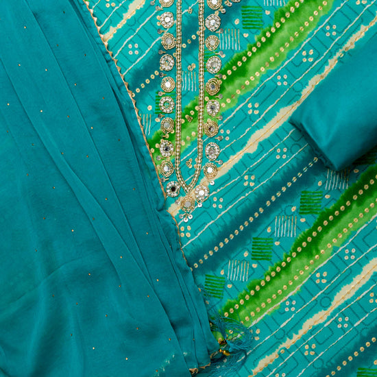 The suit features traditional Bandhani and Lehriya prints, celebrating the rich artistry of Rajasthan and Gujarat with vibrant hues and intricate tie-dye patterns. The beauty of the outfit is enhanced with delicate Cutdana work, Mirror work, Sequence work, and Zarkan embellishments, adding a touch of sparkle and sophistication to your look.
