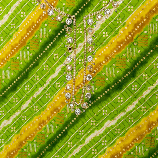 The suit features traditional Bandhani and Lehriya prints, celebrating the rich artistry of Rajasthan and Gujarat with vibrant hues and intricate tie-dye patterns. The beauty of the outfit is enhanced with delicate Cutdana work, Mirror work, Sequence work, and Zarkan embellishments, adding a touch of sparkle and sophistication to your look.