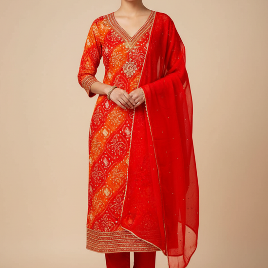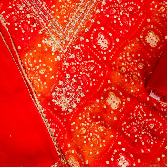 Made from Cotton, this suit with Bandhini Print, Bead, Cutdana, Digital Print, Dabka, Sequence, Swarovski & Zari Threadwork combines elegance with ease for Formal Occasion. Its Color Variations and tailoring options make it a wardrobe staple. Dry Wash / Dry Clean advised.