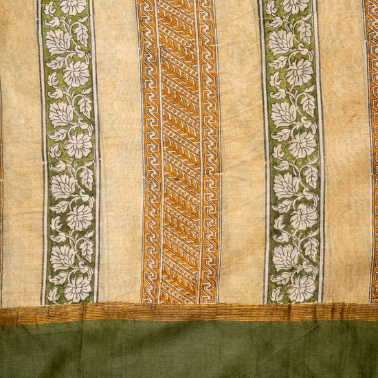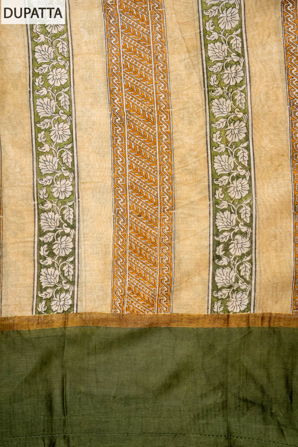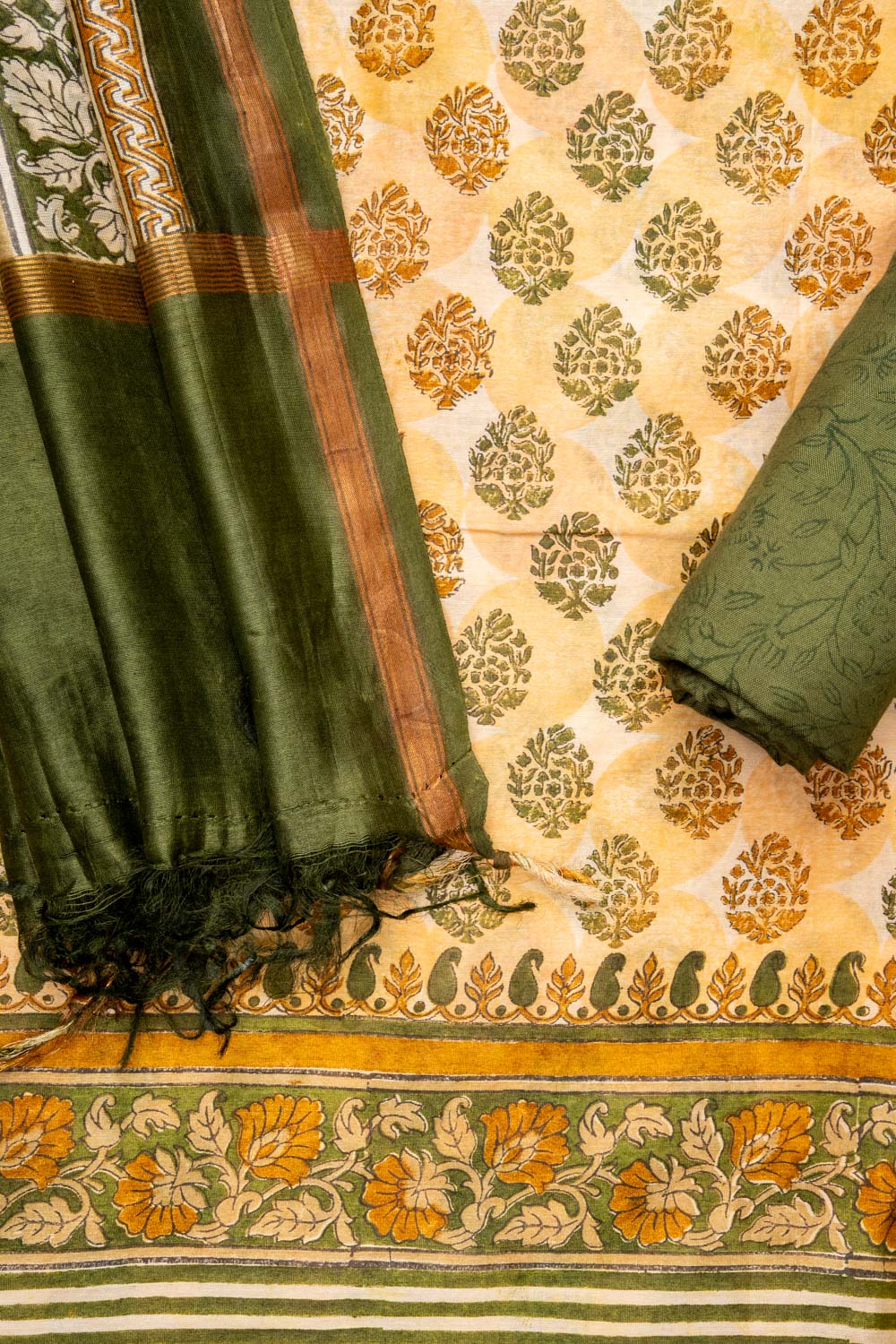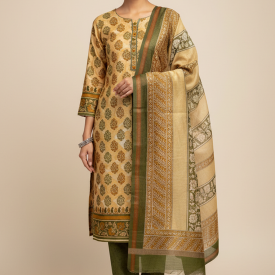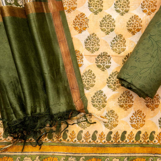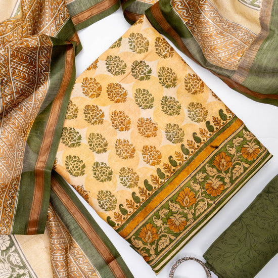Panna Tussar Mehendi Cotton Unstitched Salwar Suit With Cotton Dupatta