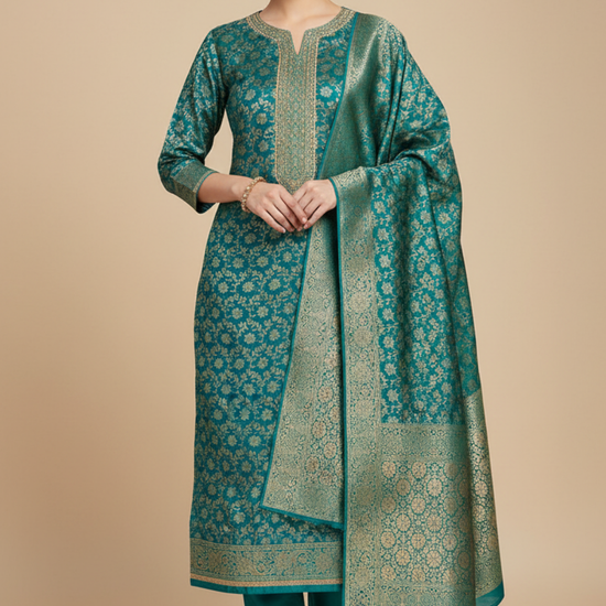 Featuring Banarasi Woven Zari & Swarovski, this Cotton unstitched suit is perfect for Formal Occasion. The Color Variations and tailoring options offer unparalleled versatility. Preserve with Dry Wash / Dry Clean.