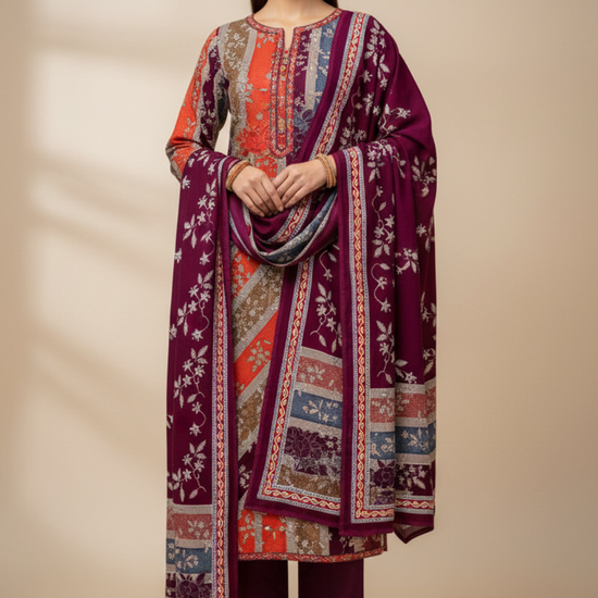With intricate Digital Print & Threadwork on luxurious Pashmina, this unstitched suit is tailored for Informal Occasion. The Color Variations make it versatile. Keep it flawless with Dry Wash / Dry Clean.