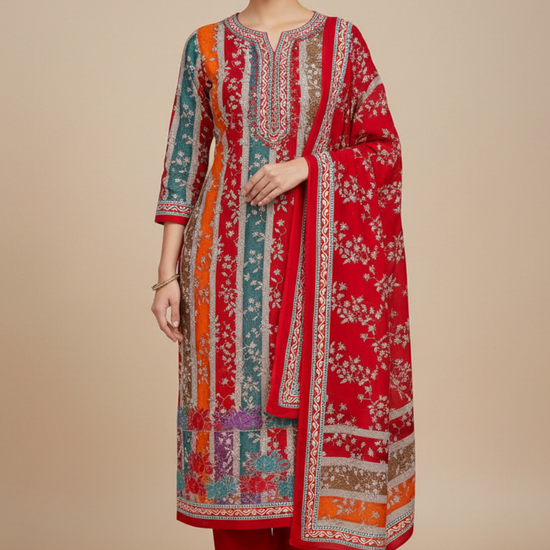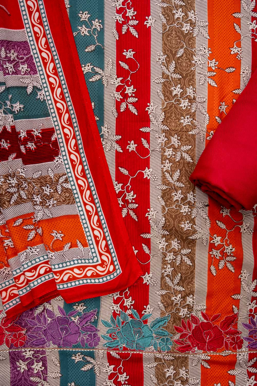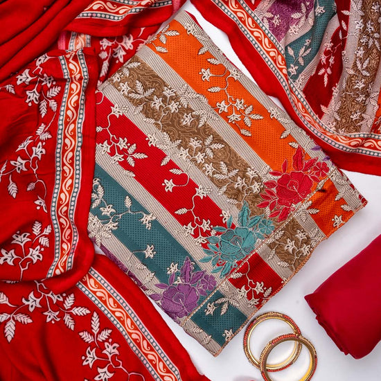 Panna Red Pashmina Unstitched Salwar Suit With Pashmina Dupatta