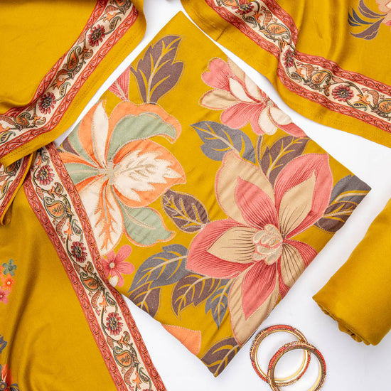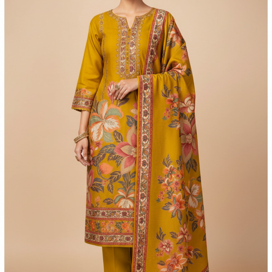 Panna Mustard Pashmina Unstitched Salwar Suit With Pashmina Dupatta