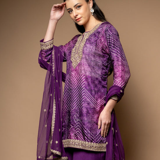 Featuring Bandhini Print, Digital Print, Sequence & Zari Thread Work, this Soft Twill suit is crafted for Formal Occasion. Its Color Variations and pre-stitching make it a go-to option. Dry Wash / Dry Clean recommended.