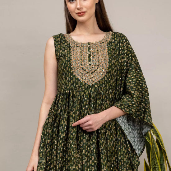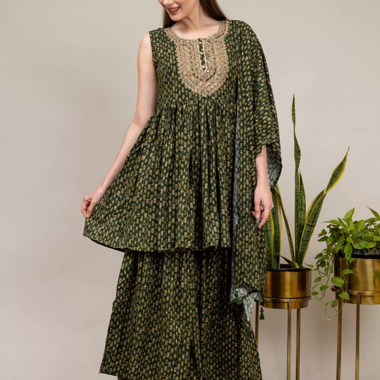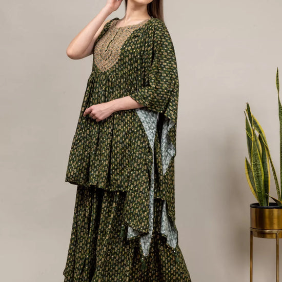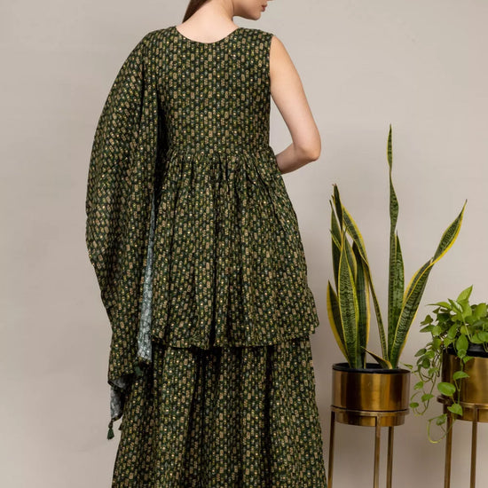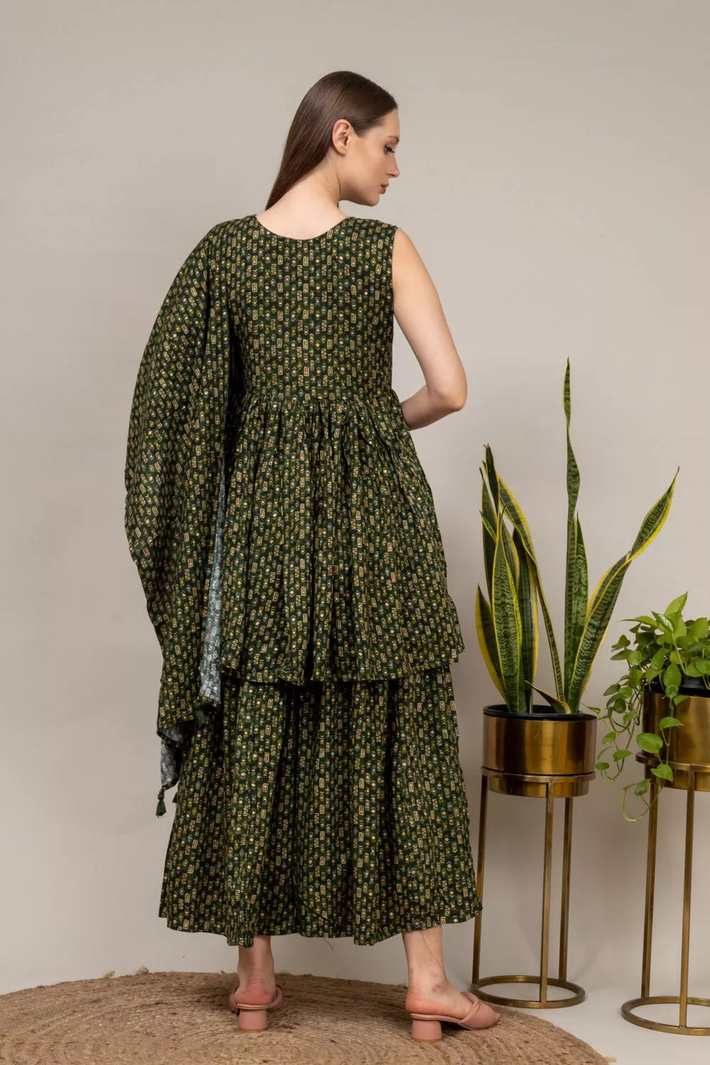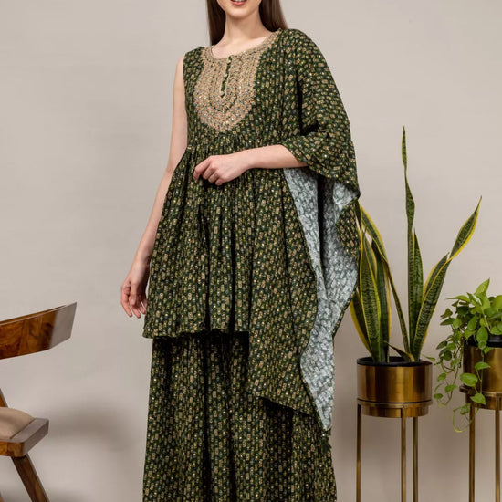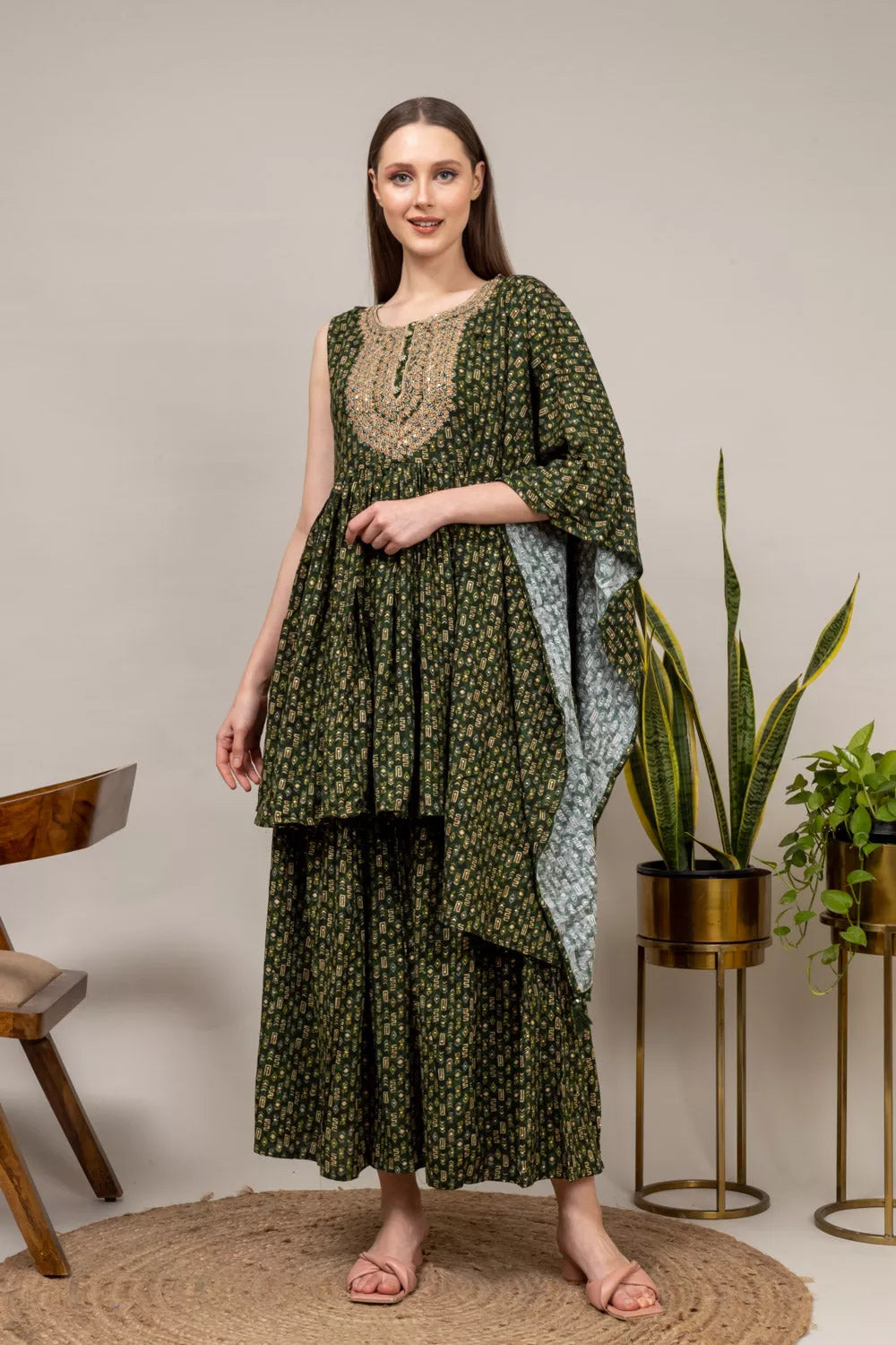 Panna Bottle Green Muslin Readymade Sharara Set With Muslin Dupatta