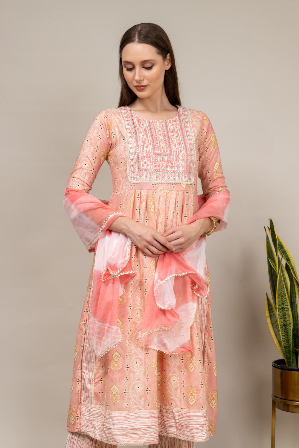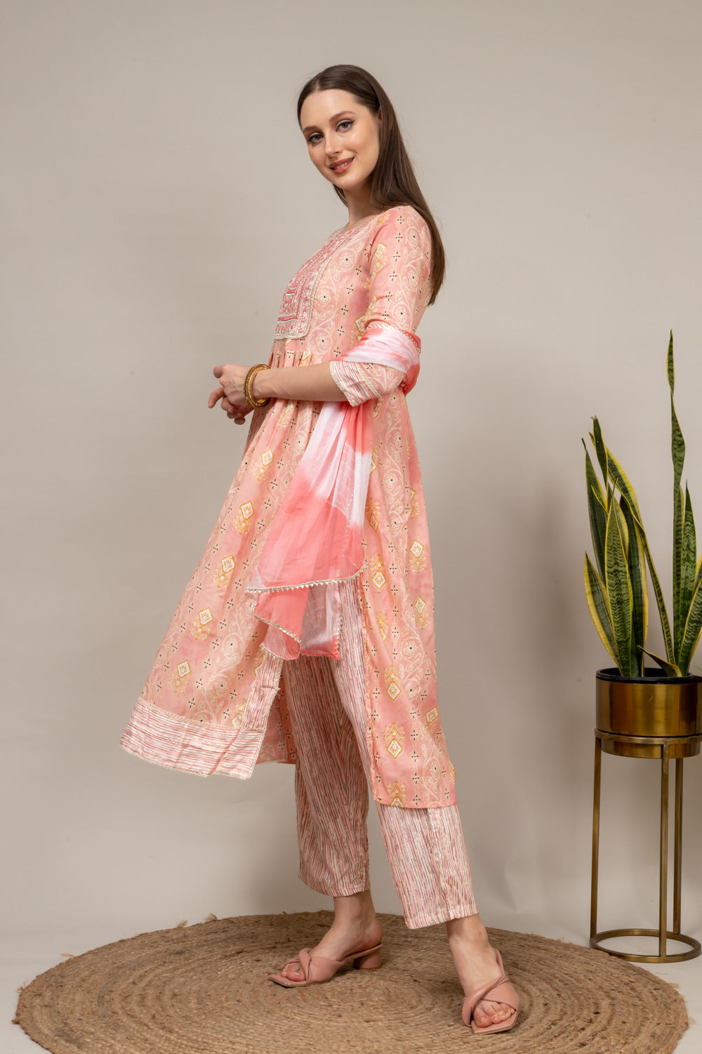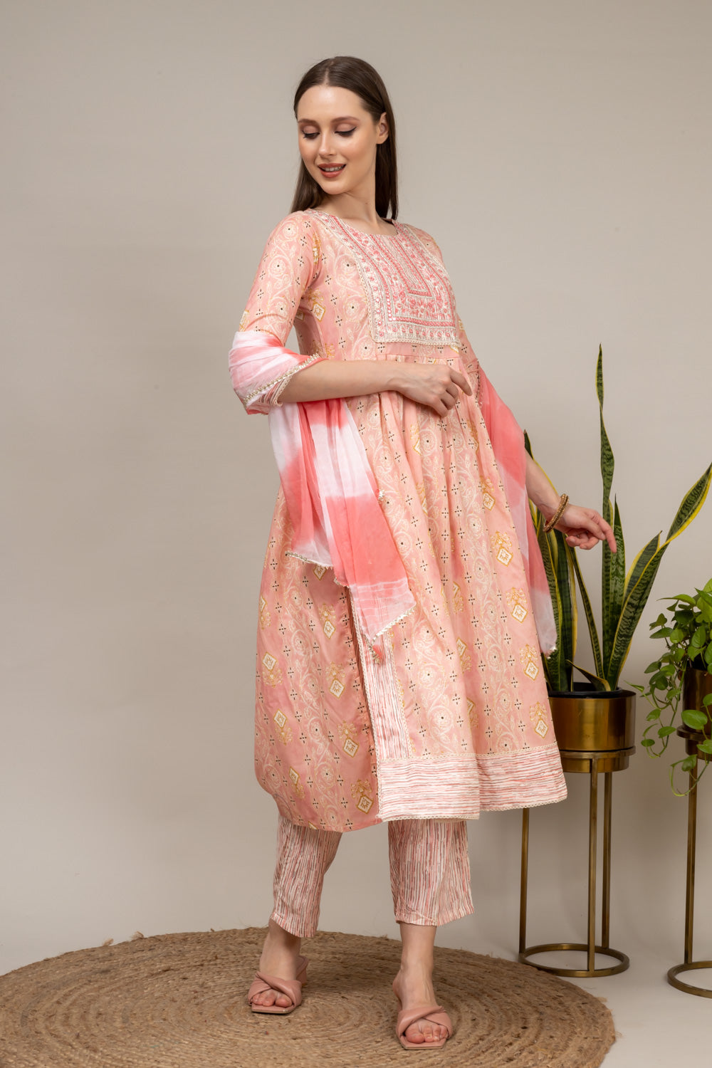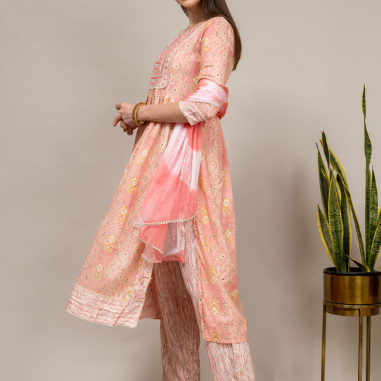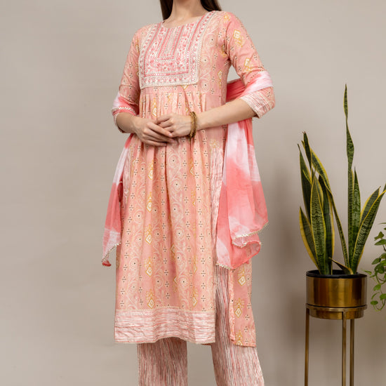 Panna Peach Cotton Readymade Suit And Pant With Chiffon Dupatta