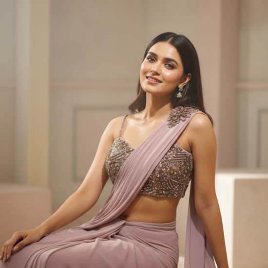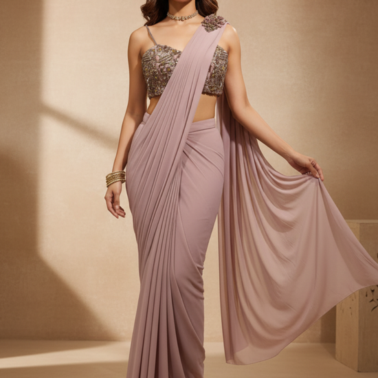Panna Onion Lycra Pre-Draped Designer Saree With Readymade Blouse