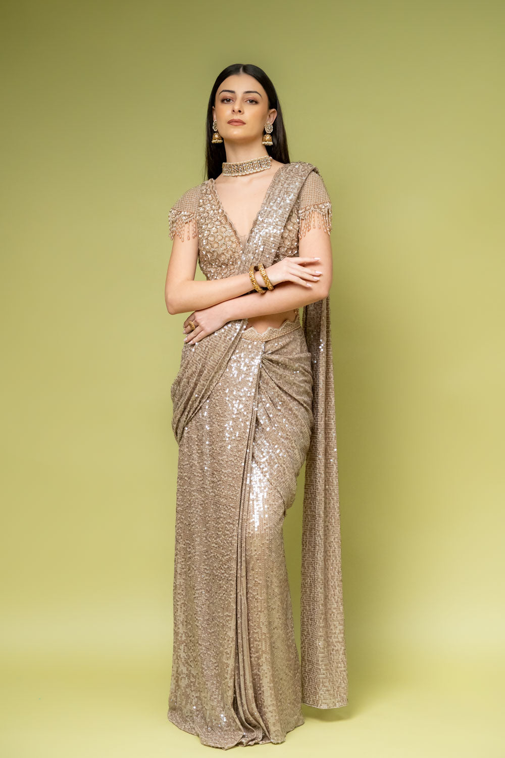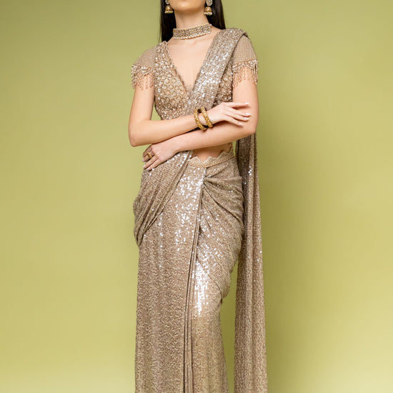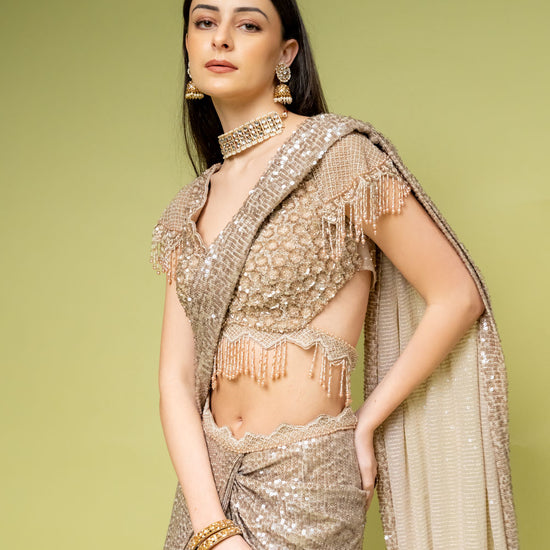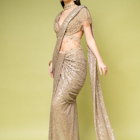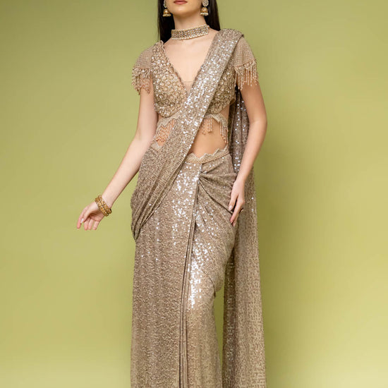 Panna Tussar Net Pre-Draped Designer Saree With Readymade Blouse