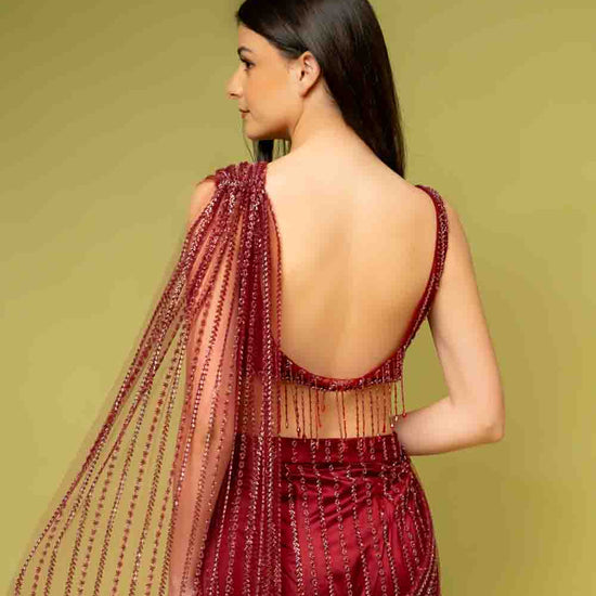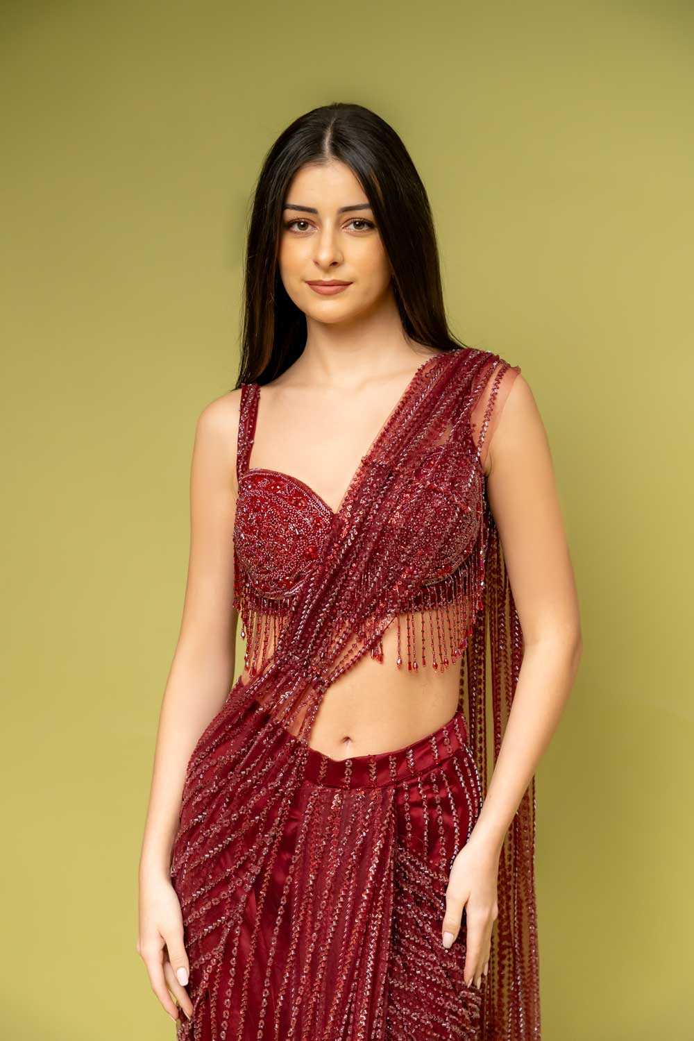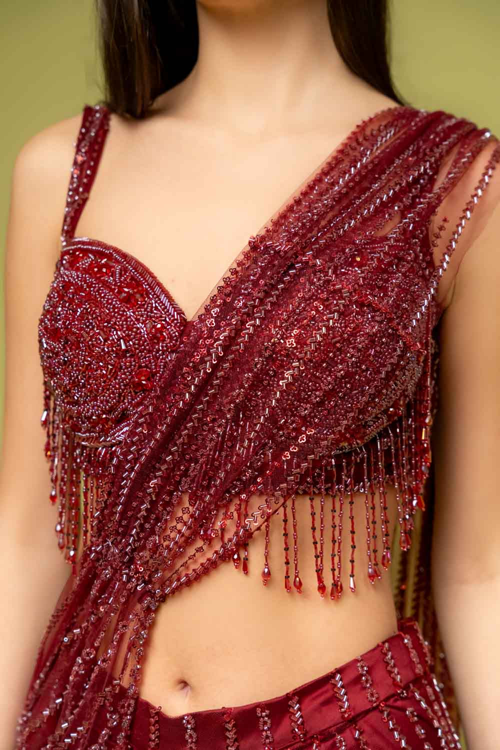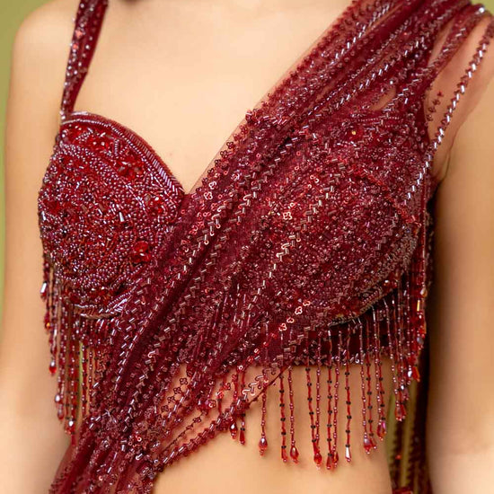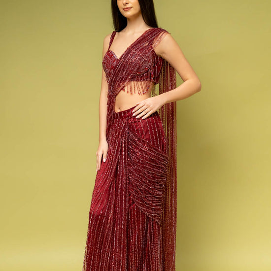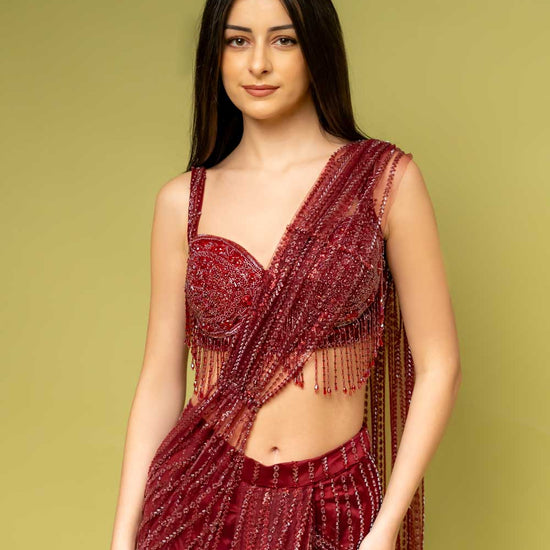 Panna Maroon Net Pre-Draped Designer Saree With Readymade Blouse