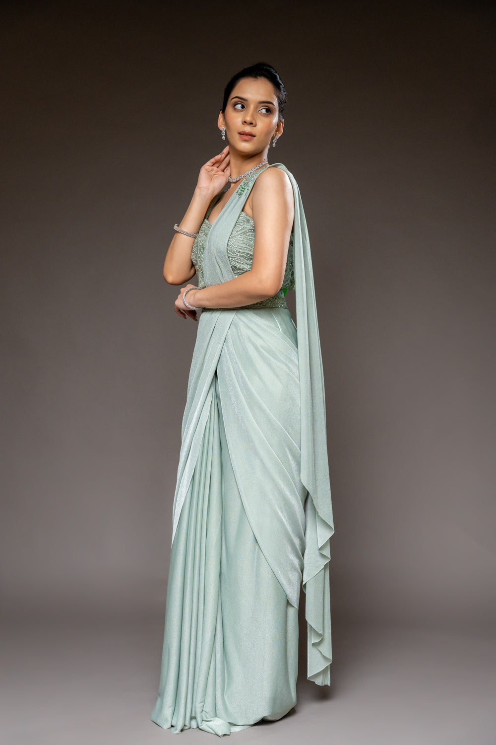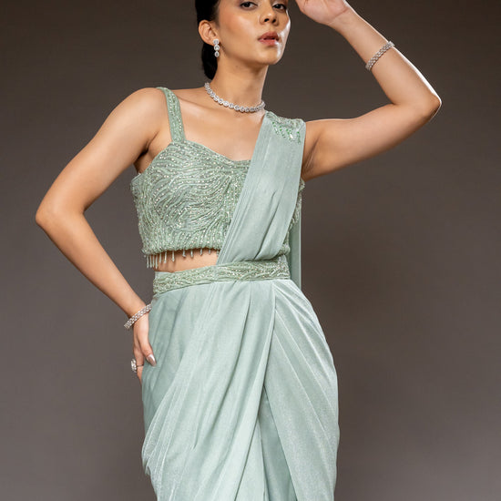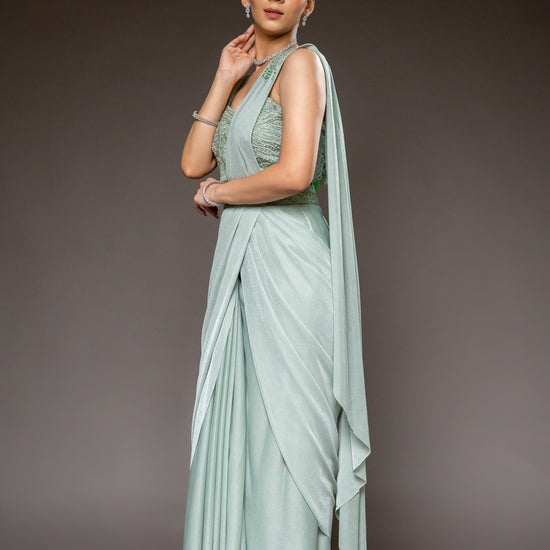 Panna Pista Shimmer Pre-Draped Designer Saree With Readymade Blouse