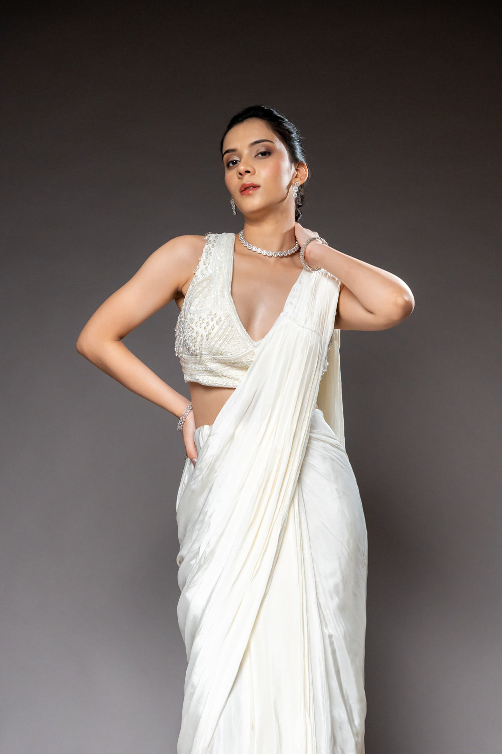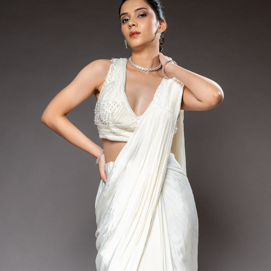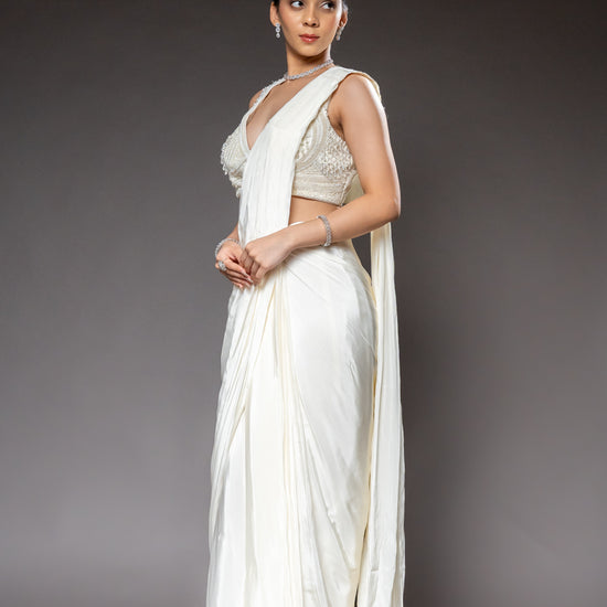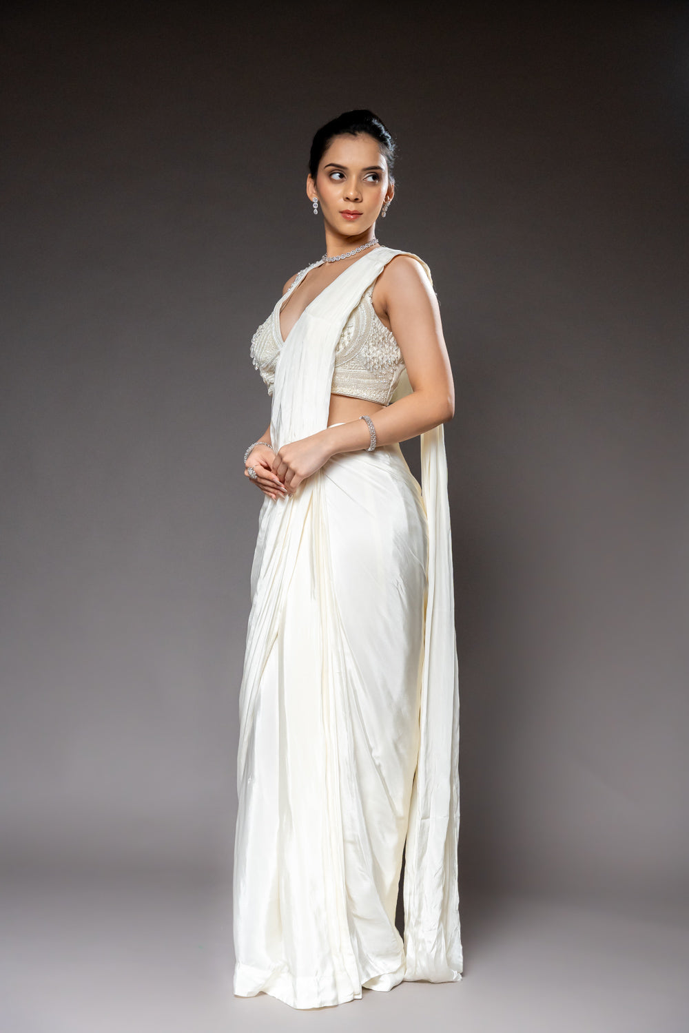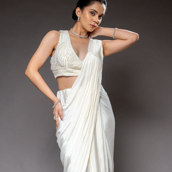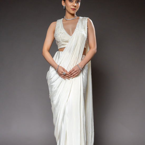 Panna White Lycra Pre-Draped Designer Saree With Readymade Blouse
