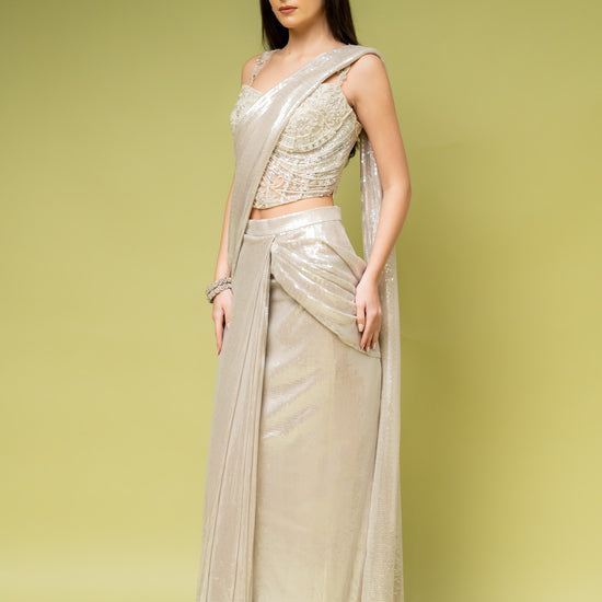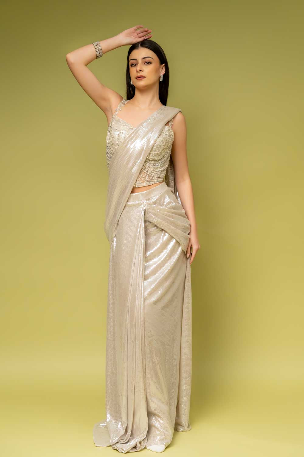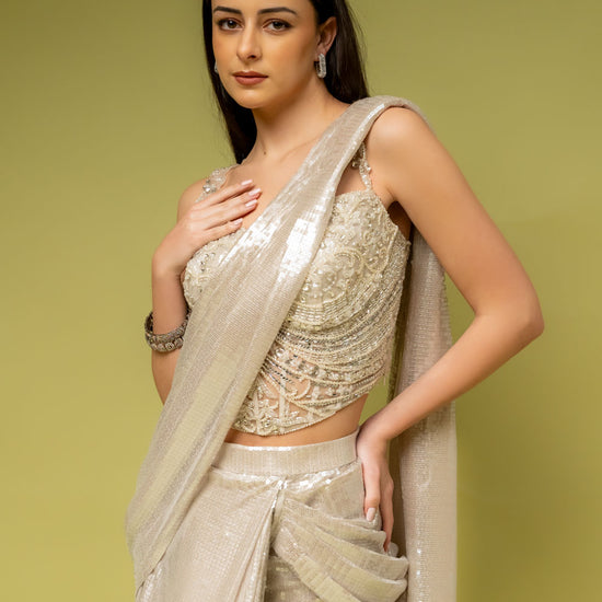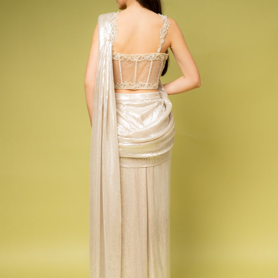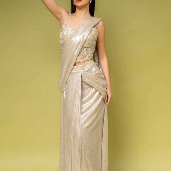 Panna White Net Pre-Draped Designer Saree With Readymade Blouse