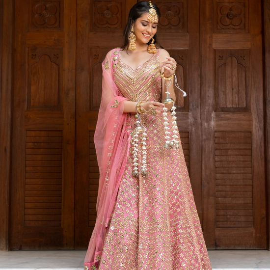 Panna Gajari Georgette Lehenga Set And Net Dupatta With Readymade Blouse