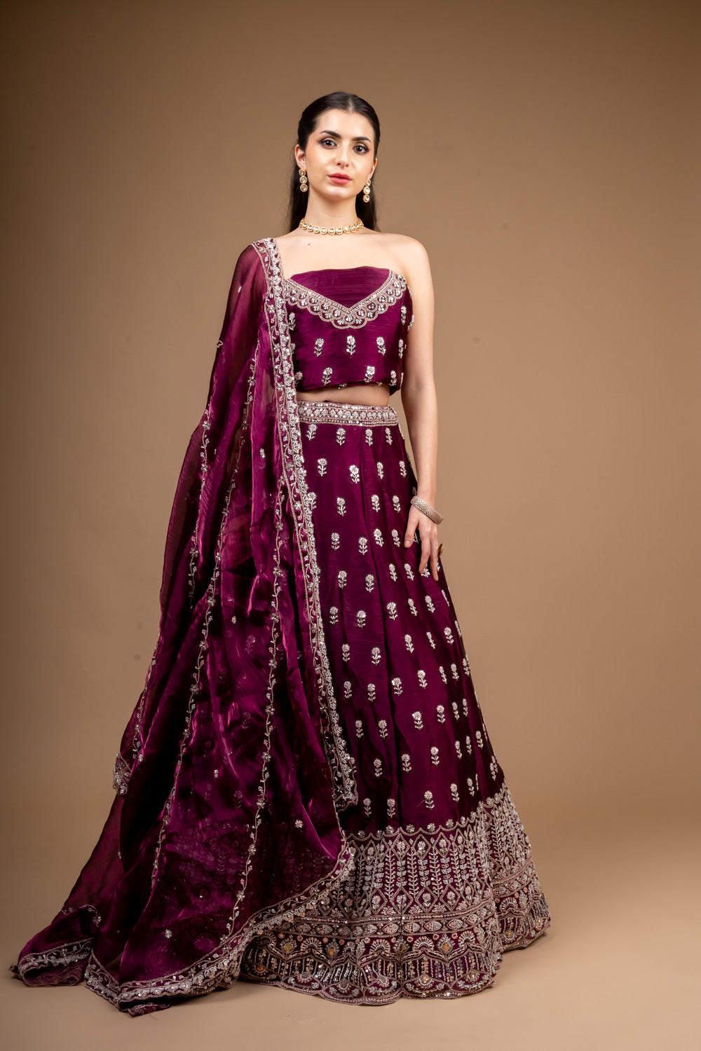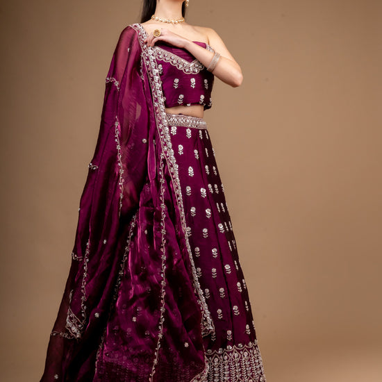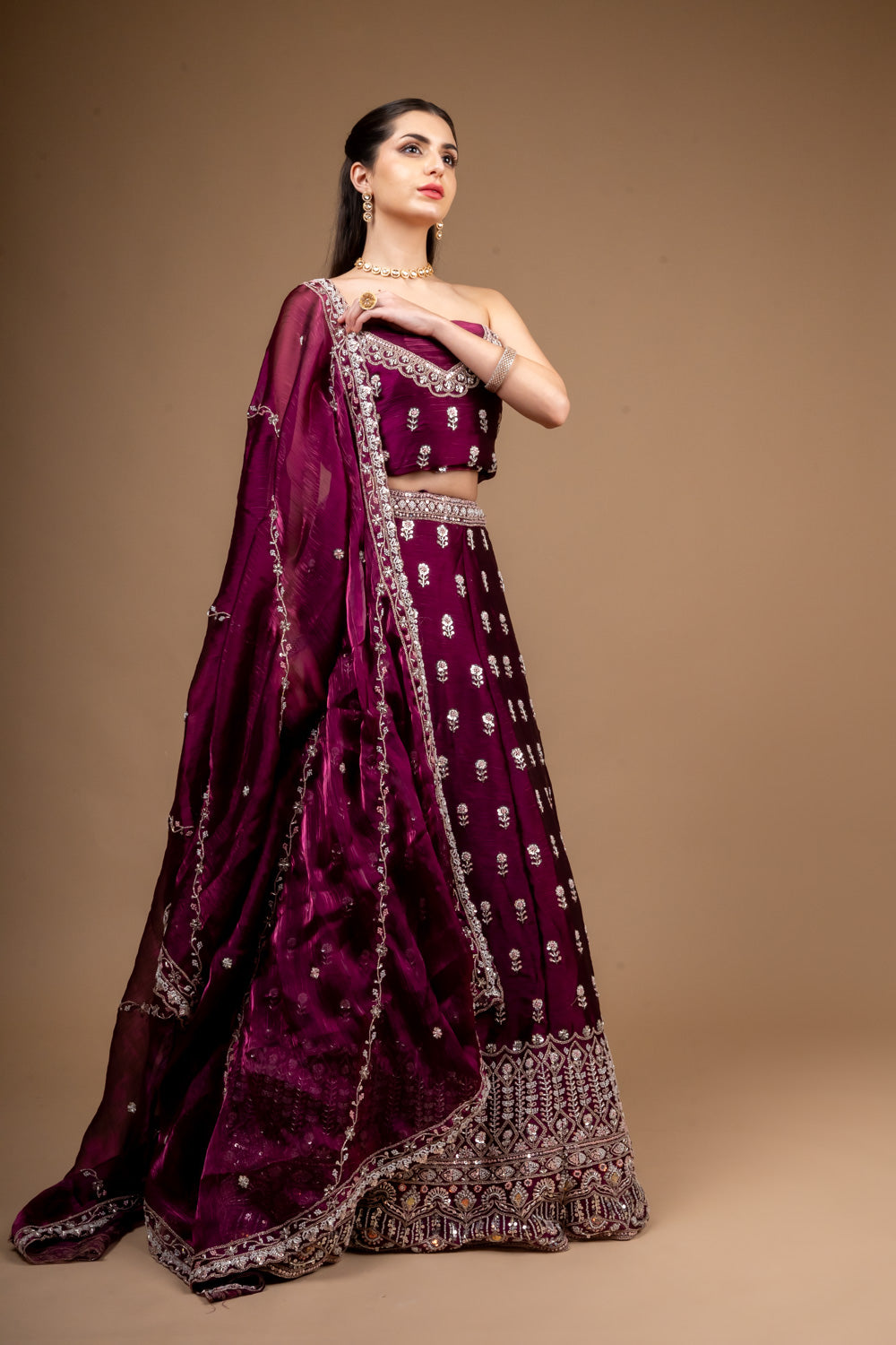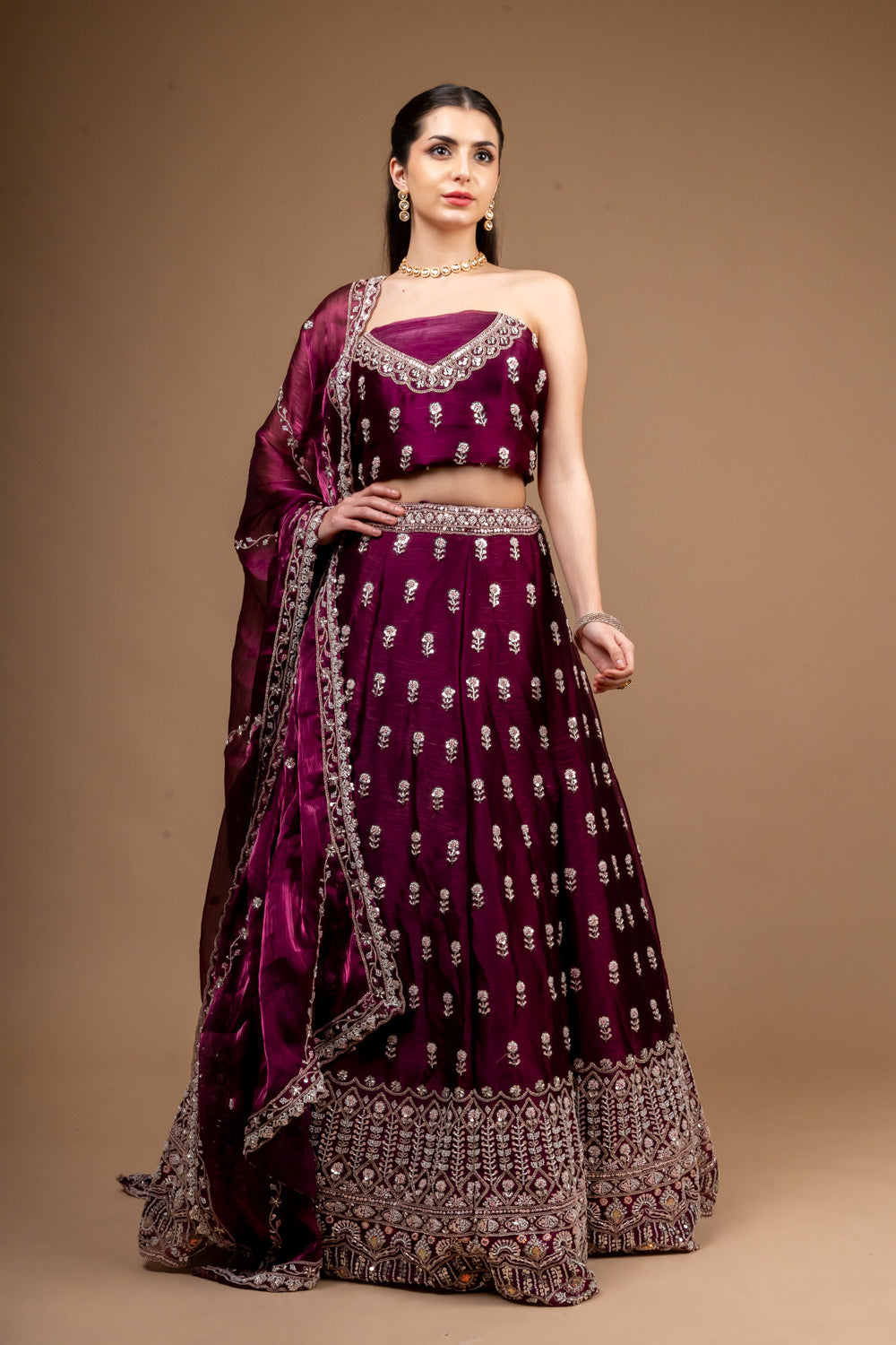 Panna Wine Zari Threadwork, Embroidery & Sequence Organza Lehenga Set With Unstitched Blouse