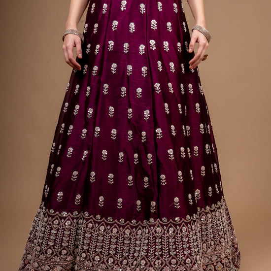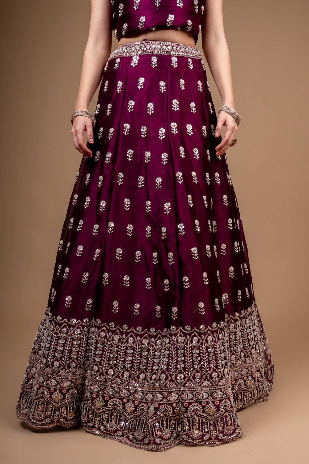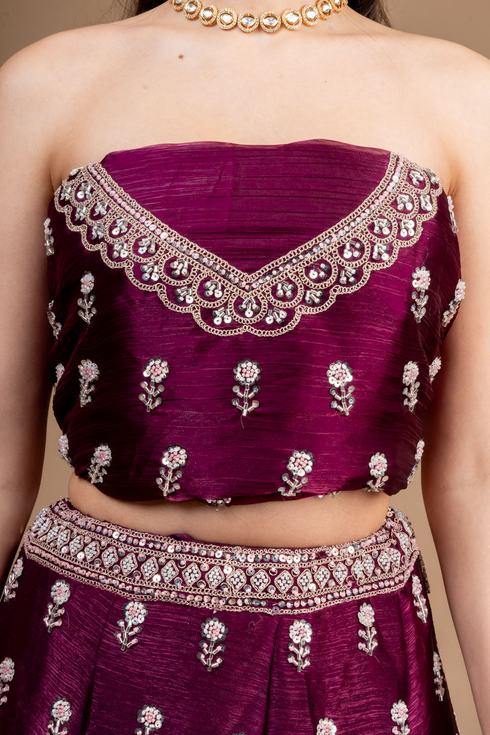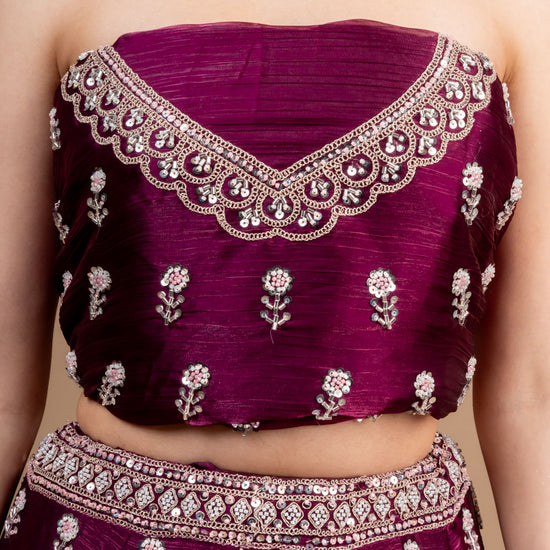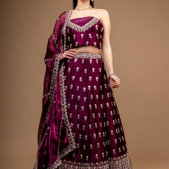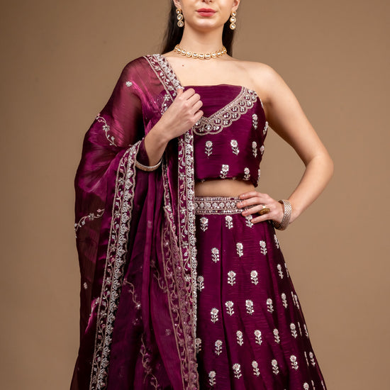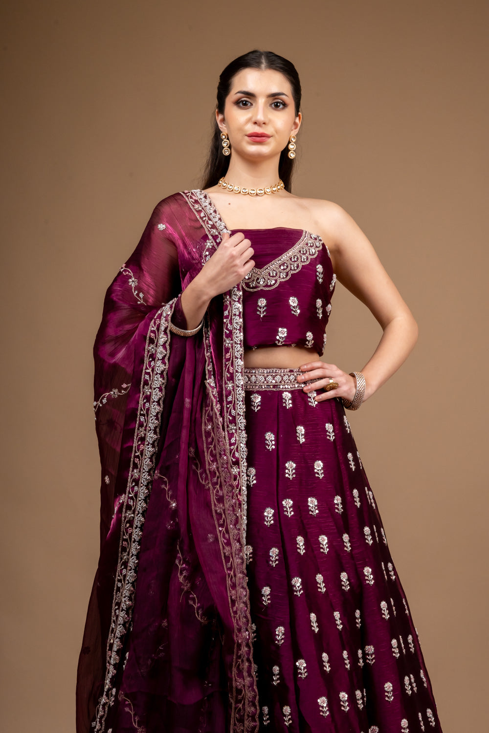 Panna Wine Zari Threadwork, Embroidery & Sequence Organza Lehenga Set With Unstitched Blouse