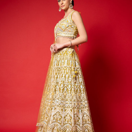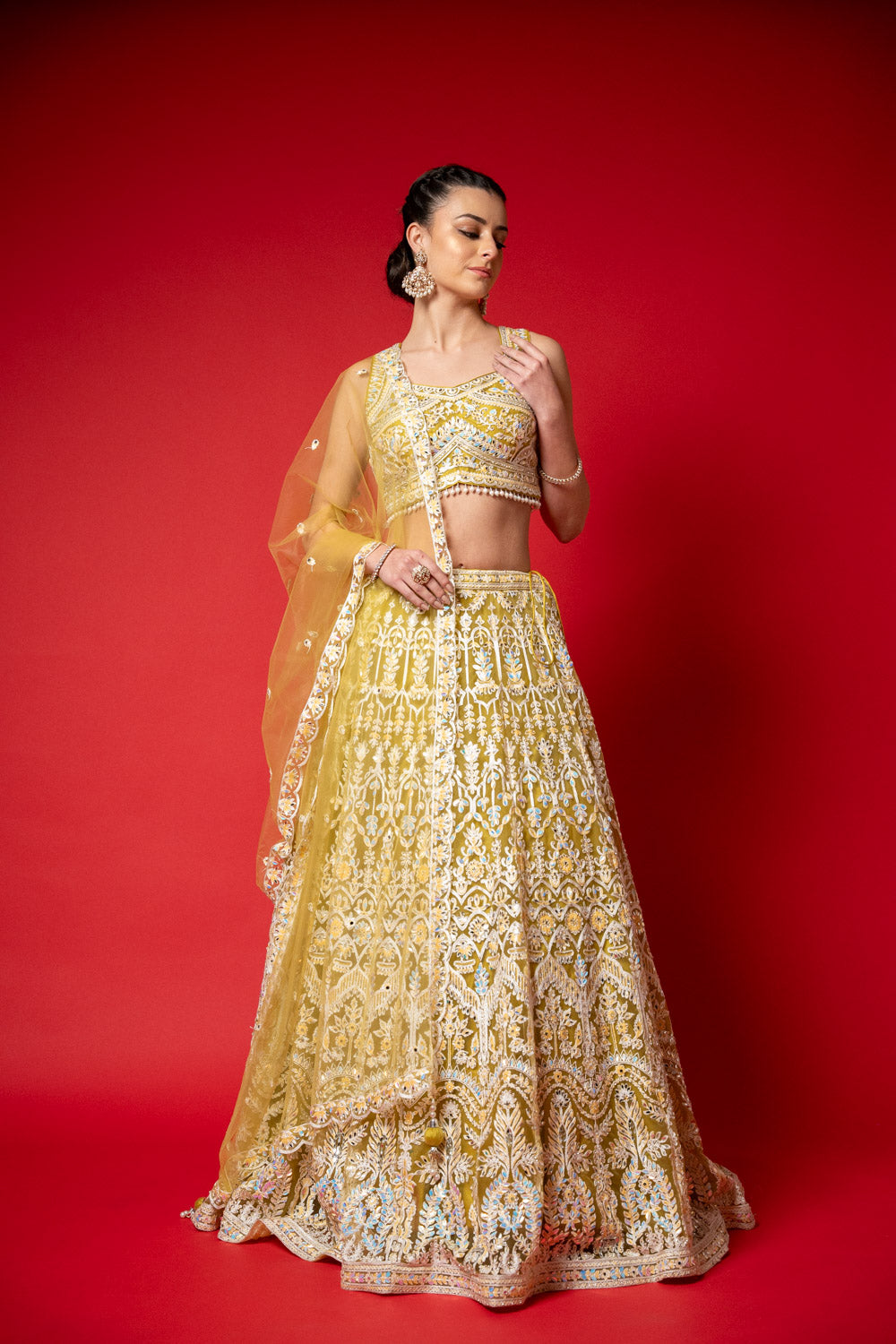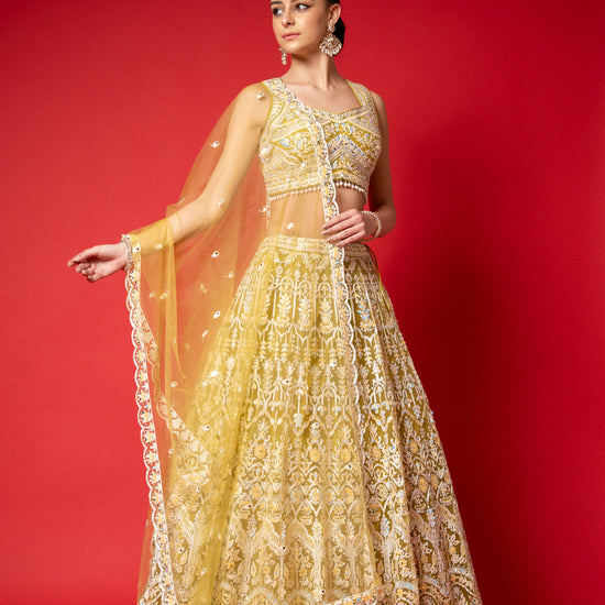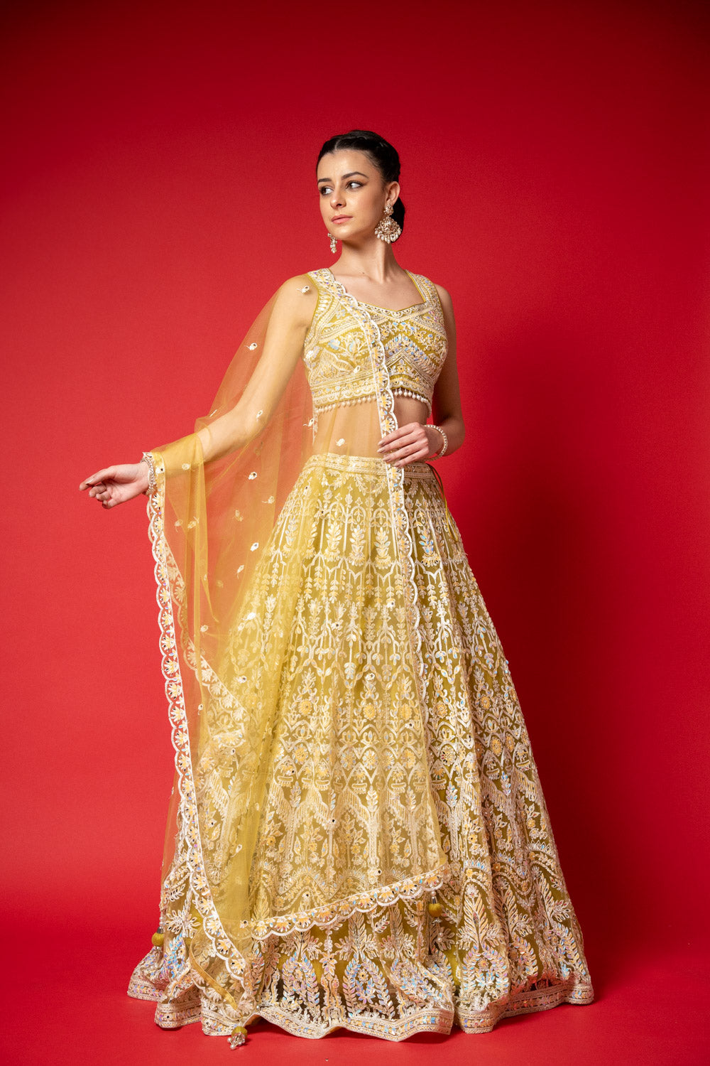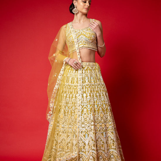 Pista Swarovski, Mirror, Threadwork, Embroidery & Bead Sequence Net lehenga Set With Readymade Blouse