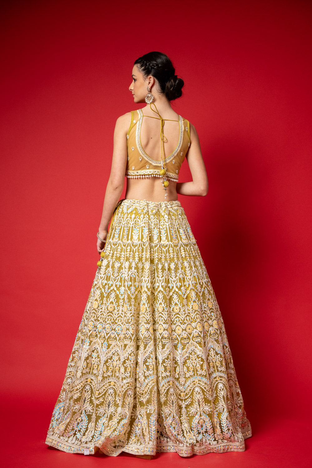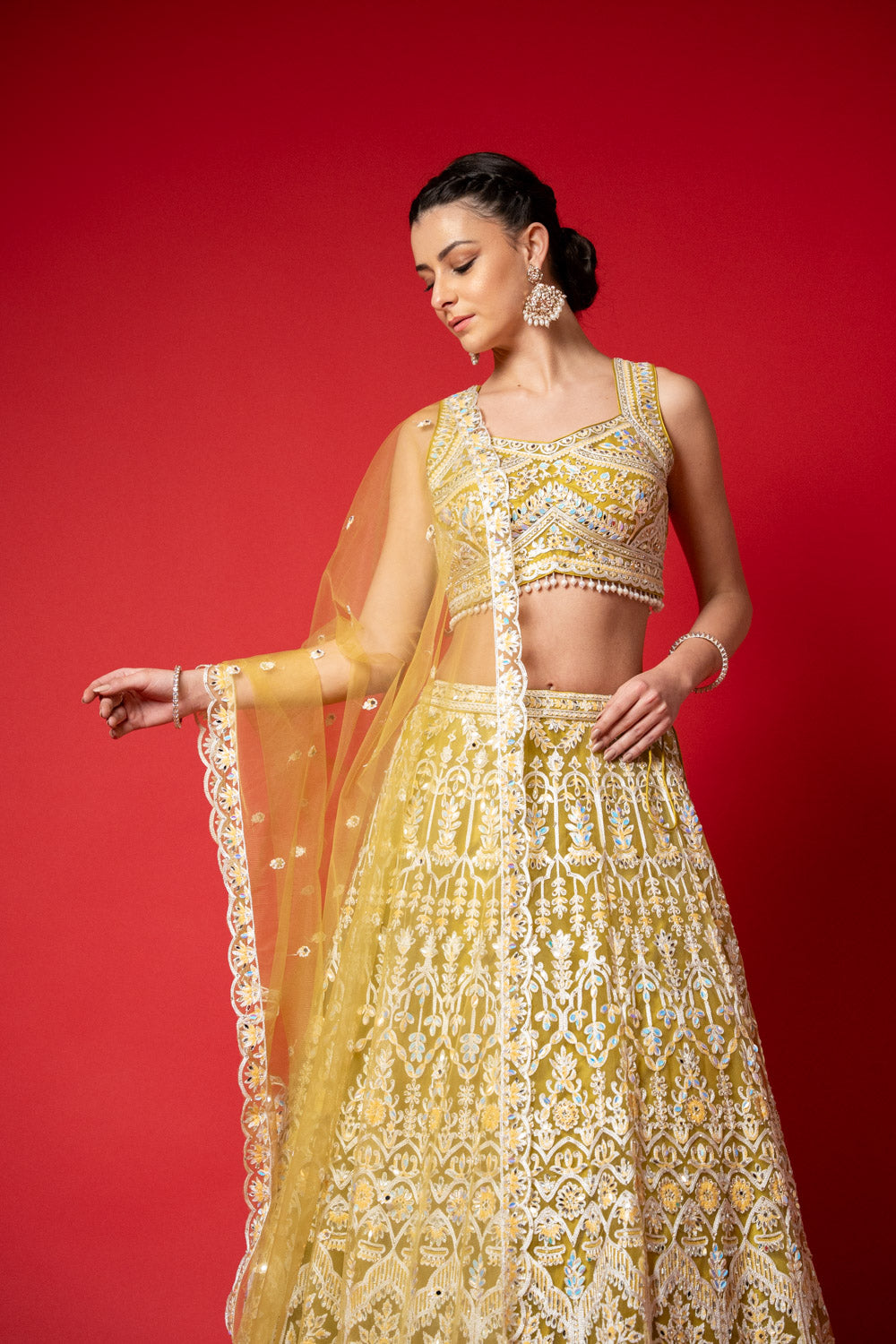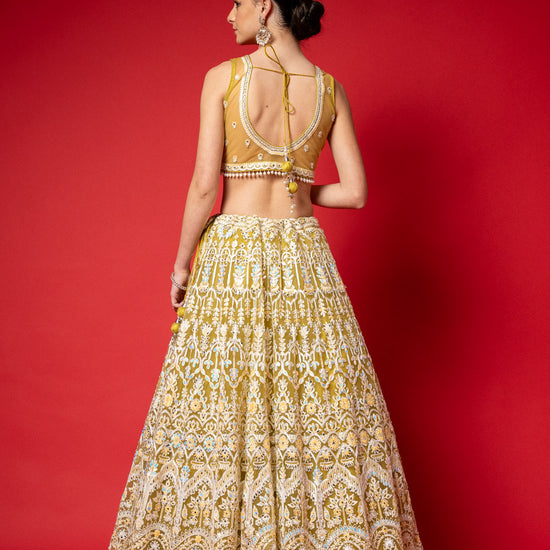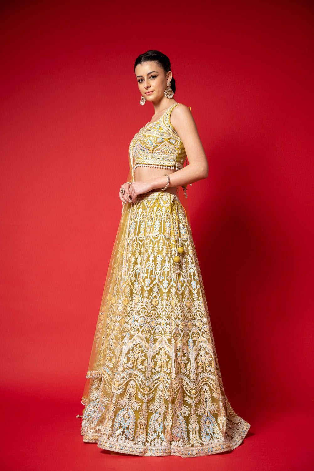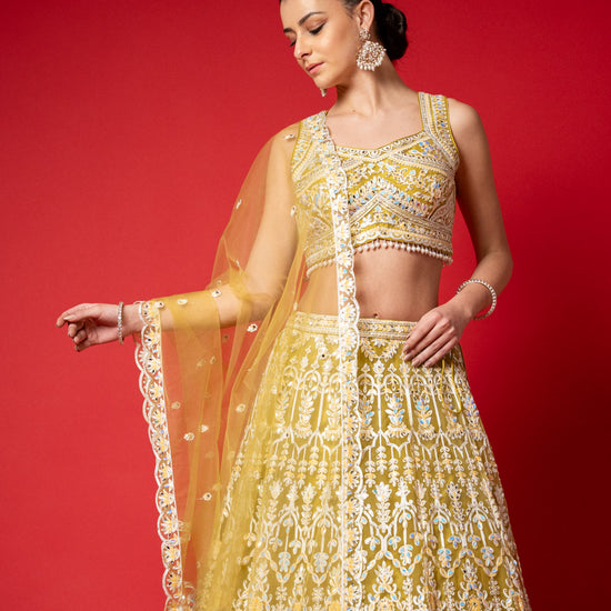 Panna Pista Swarovski, Mirror, Threadwork, Embroidery & Bead Sequence Net lehenga Set With Readymade Blouse