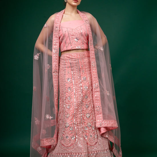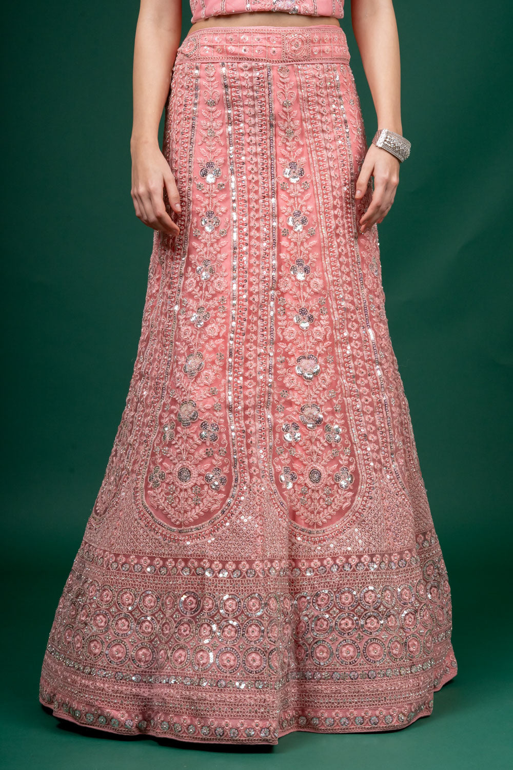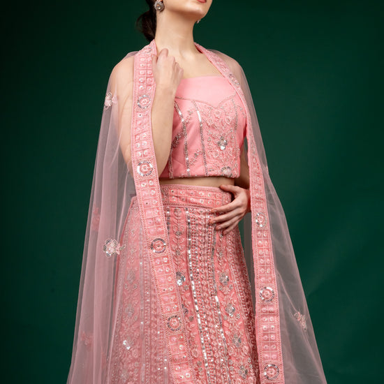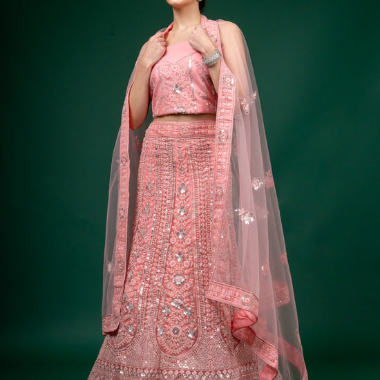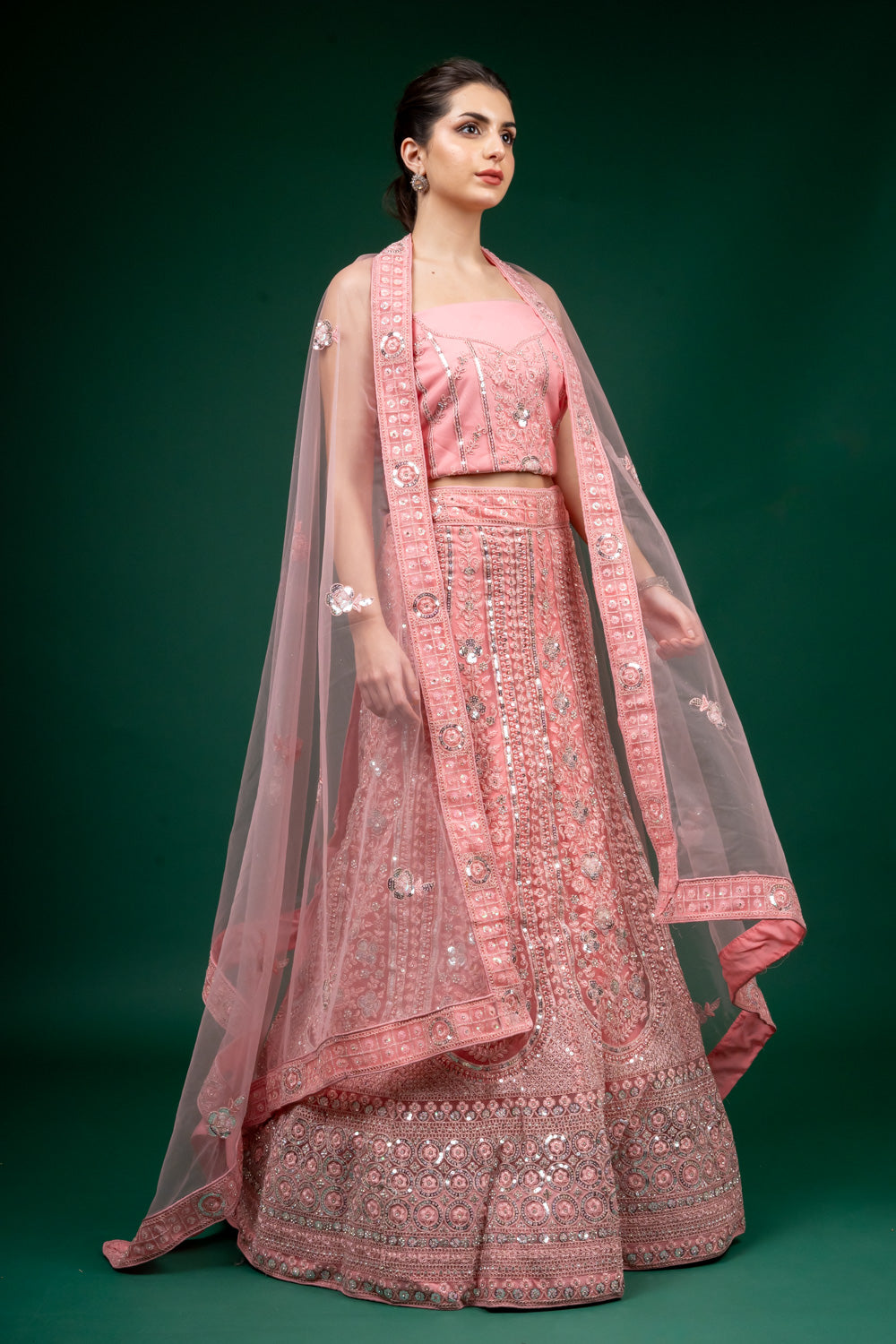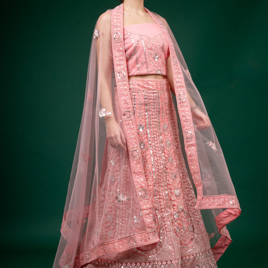 This Net lehenga, adorned with Sequence, Zari & Zarkan is perfect for PartyWear. Maintain with Dry Wash / Dry Clean.