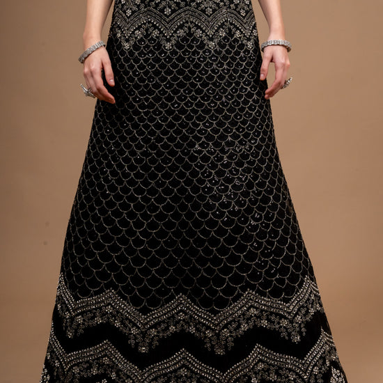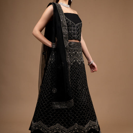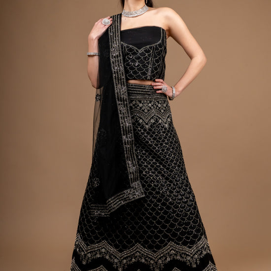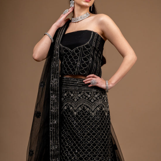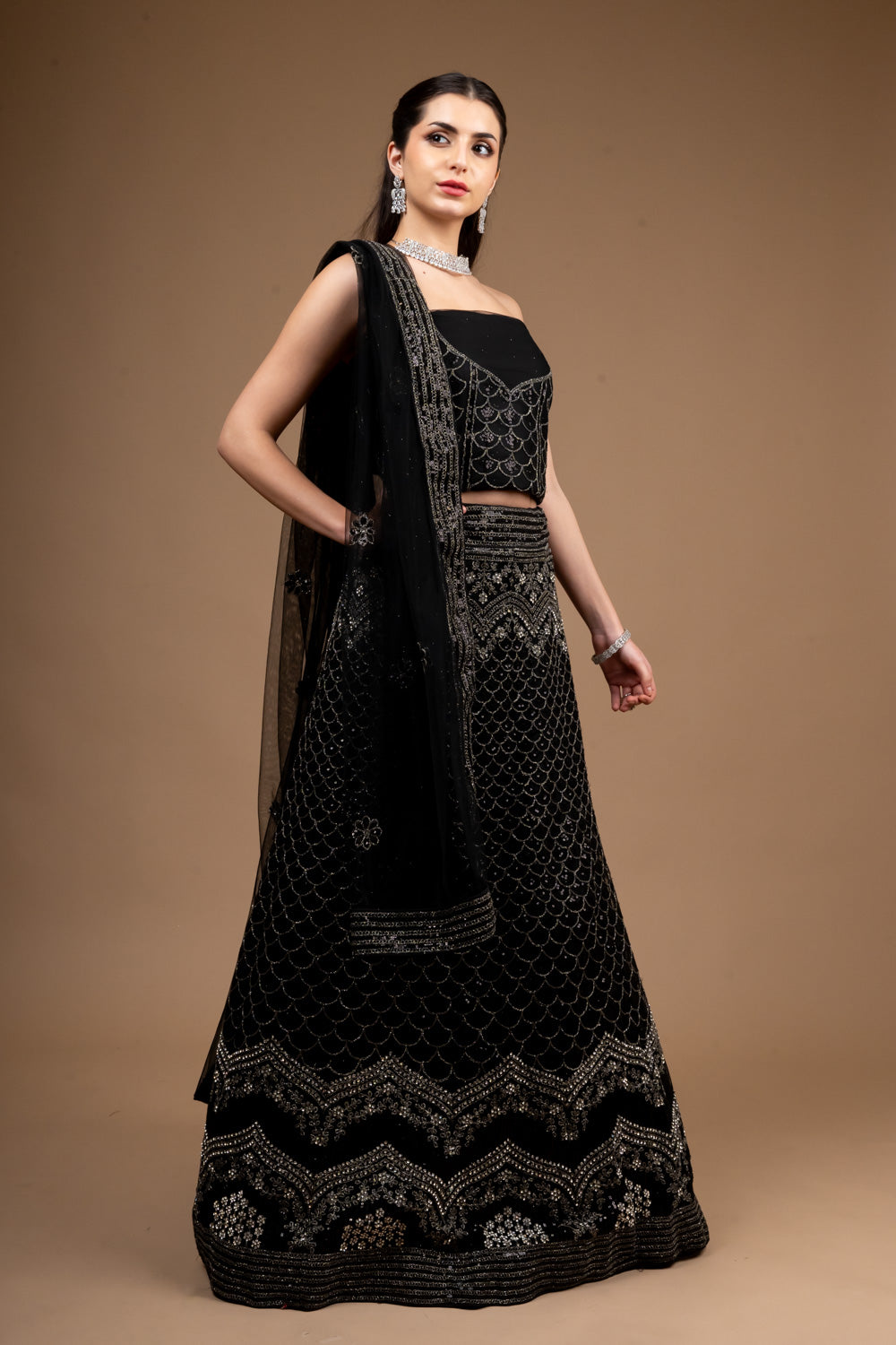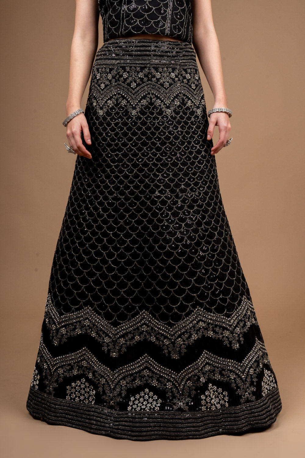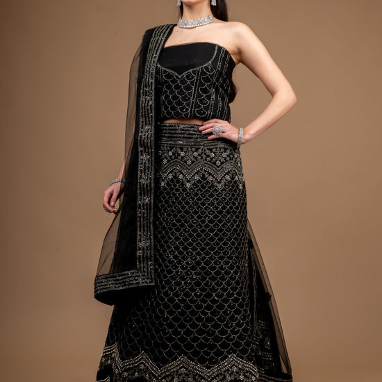 Panna Black Zari Threadwork & Sequence Net Lehenga Set With Unstitched Blouse