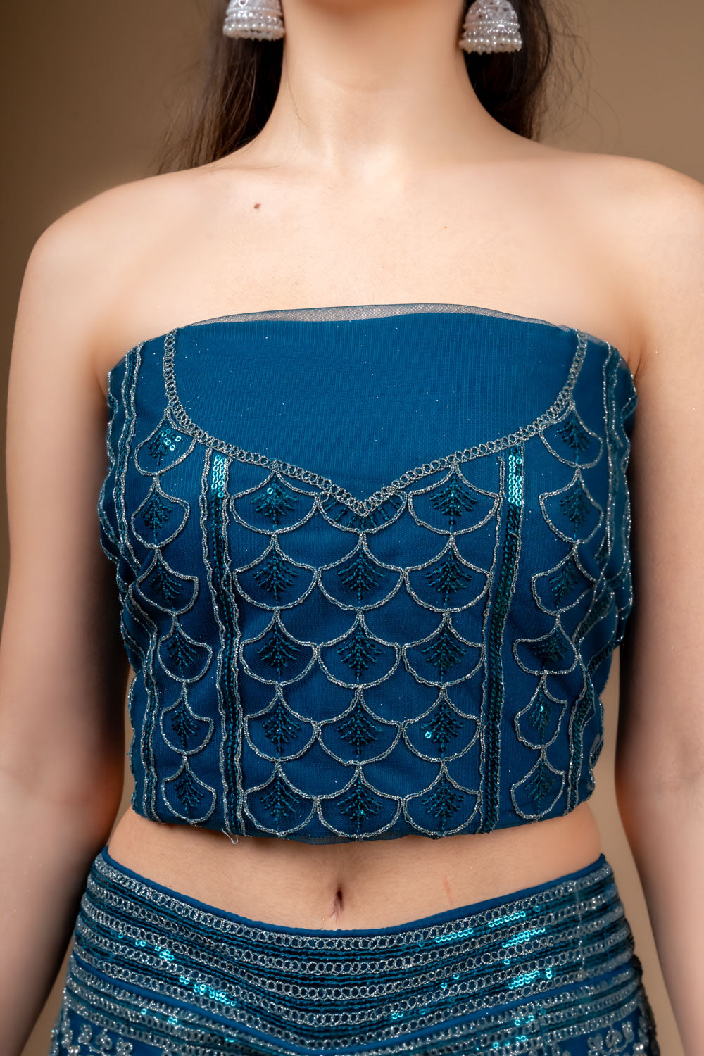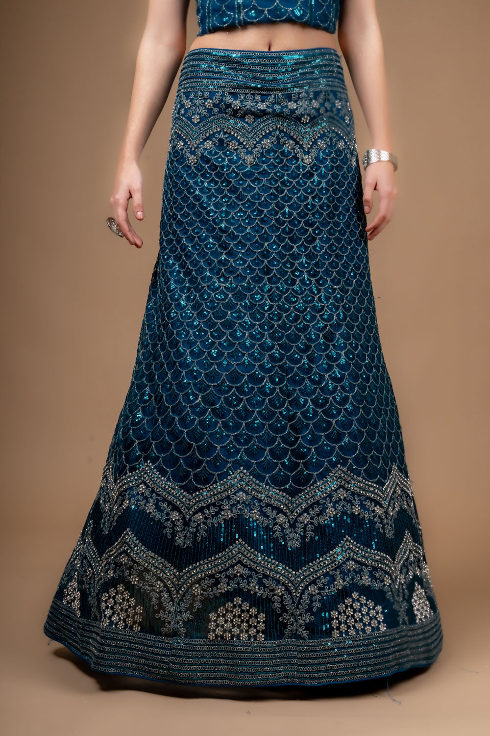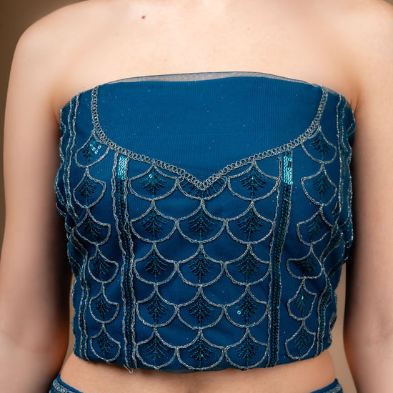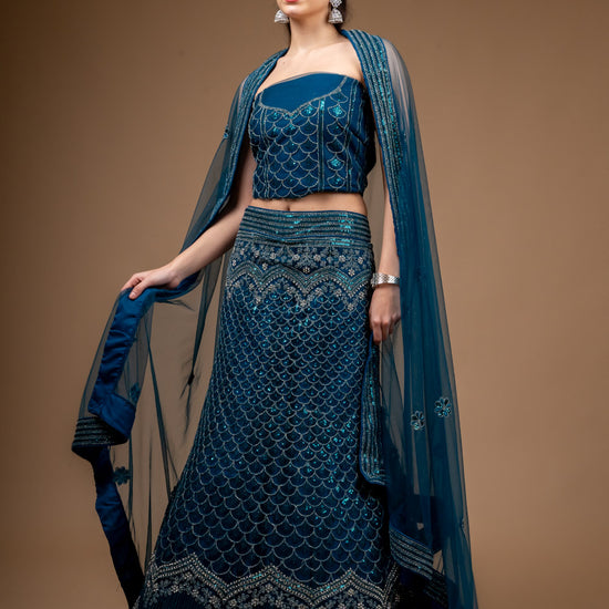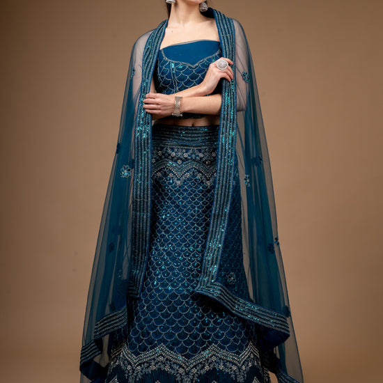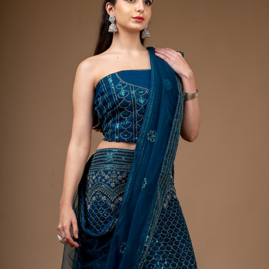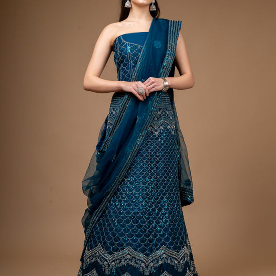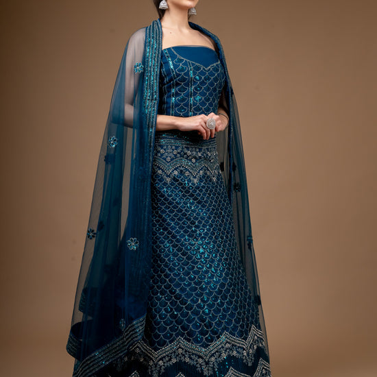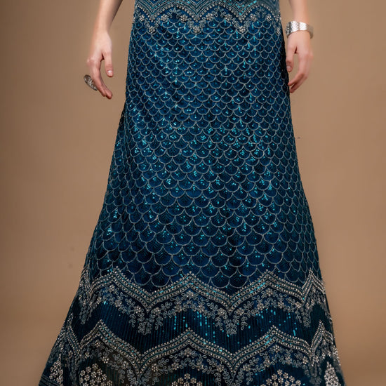 This Net lehenga, adorned with Zarkan, Zari Threadwork Embroidery & Sequence Work, is perfect for PartyWear Its timeless elegance and Peacock make it a standout. Maintain with Dry Wash/Dry Clean.
