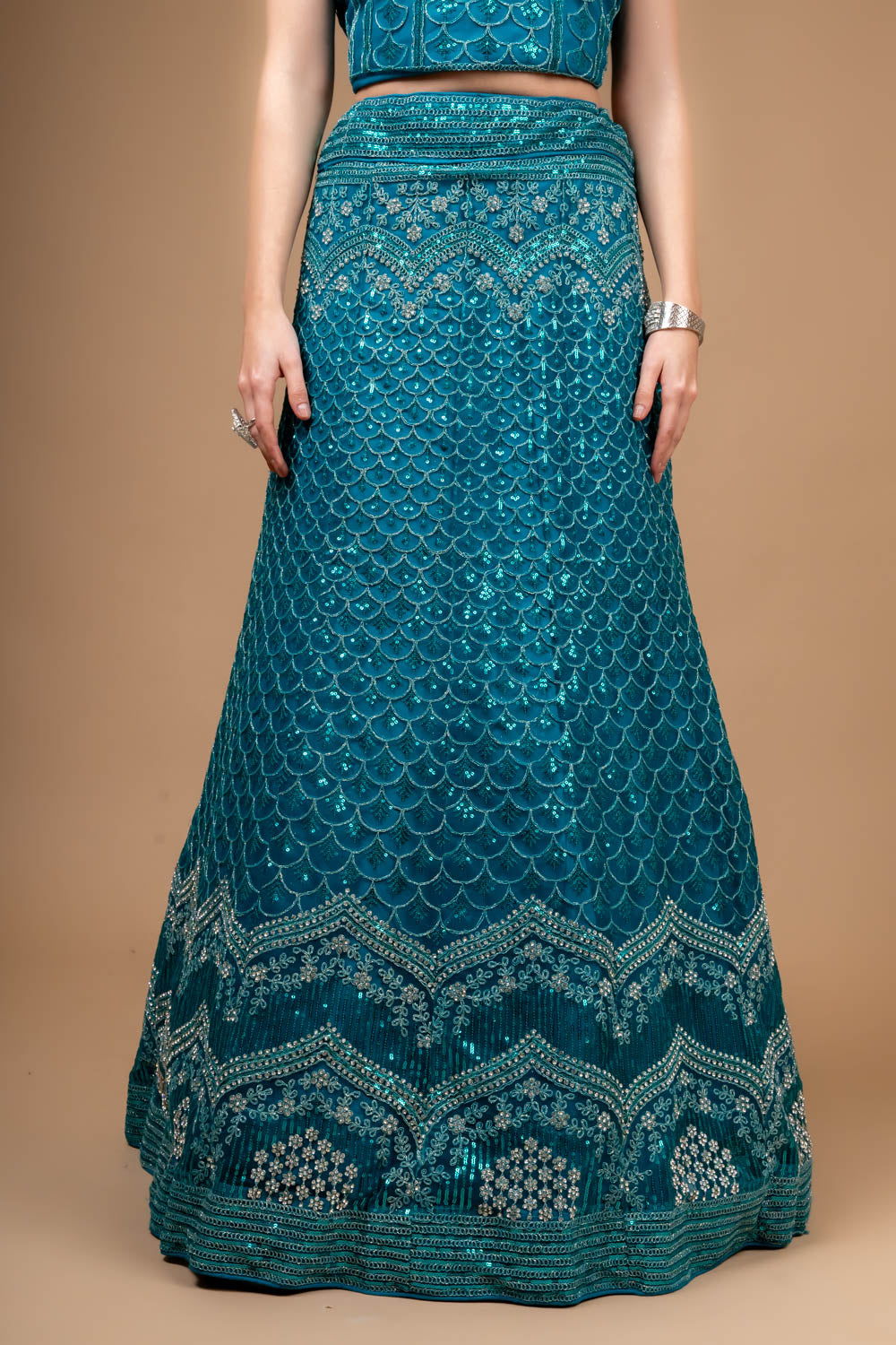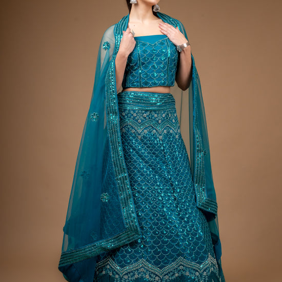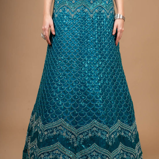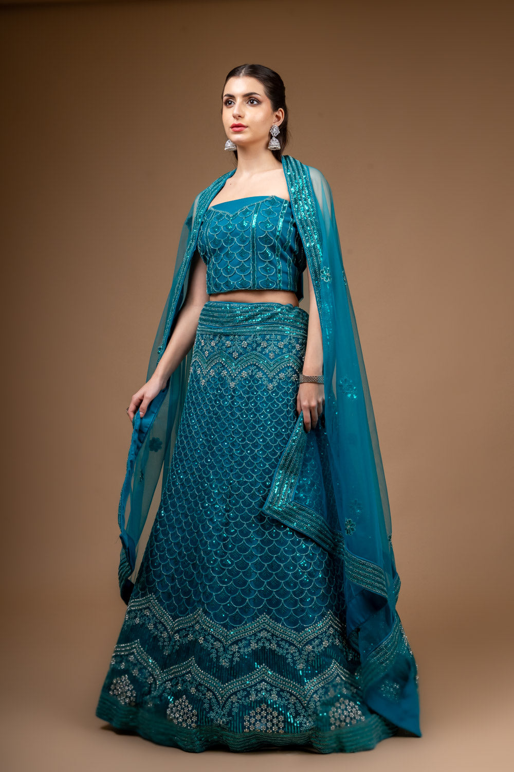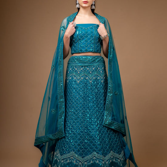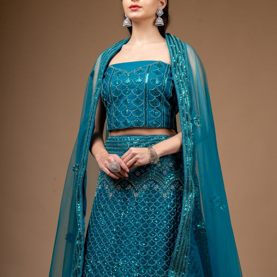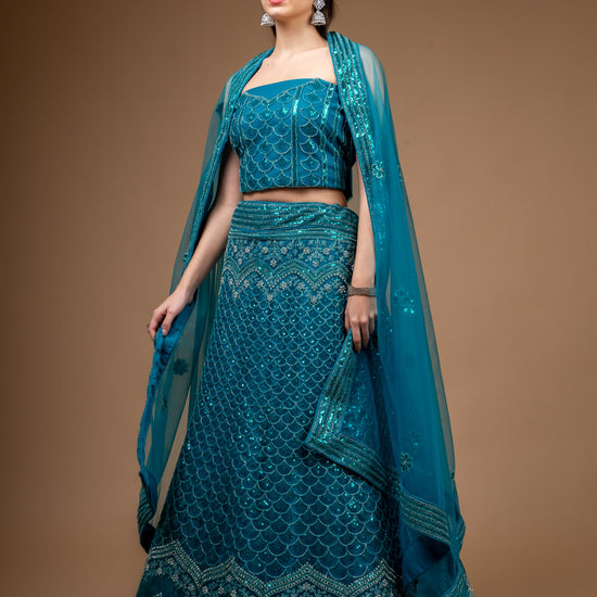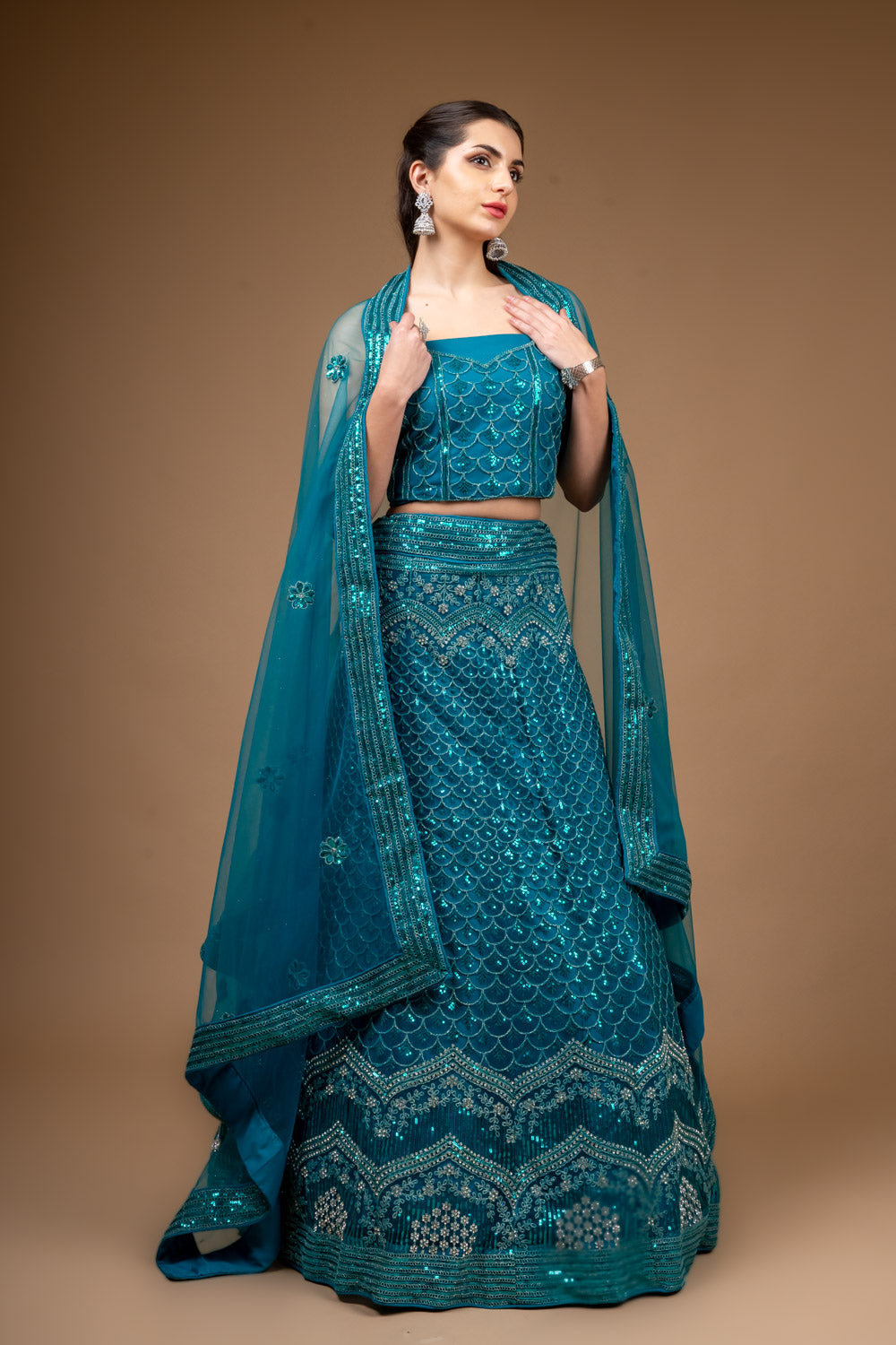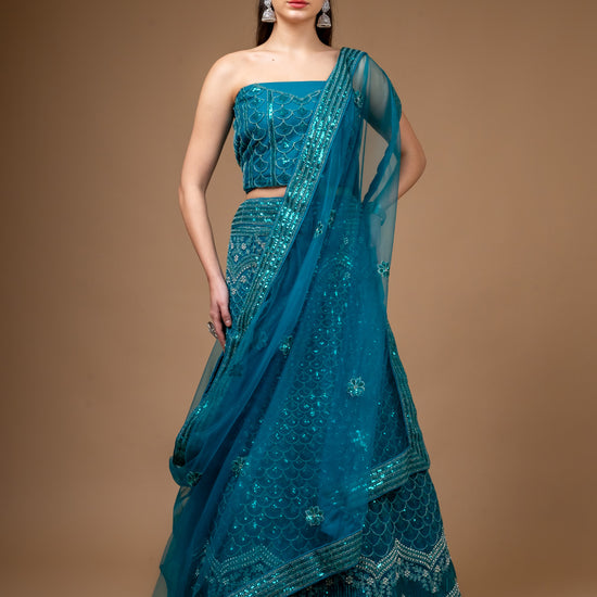 Panna Rama Zari Threadwork & Sequence Net Lehenga Set With Unstitched Blouse