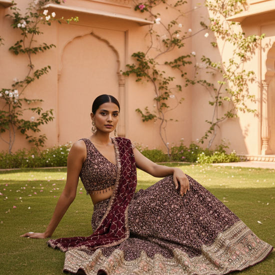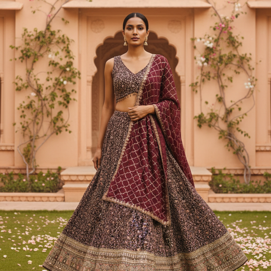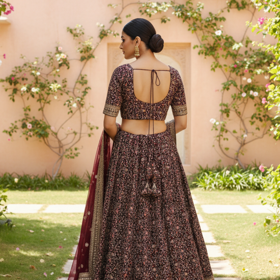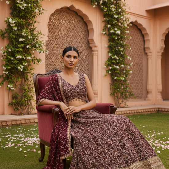 Panna Garnet Georgette Lehenga Set And Net Dupatta With Readymade Blouse
