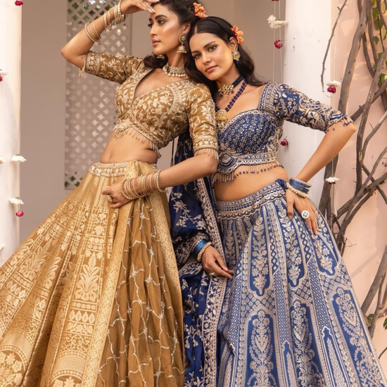Step into regal elegance with this exquisite Banarasi silk lehenga, crafted to embody timeless heritage and modern luxury. The rich Banarasi silk fabric exudes a royal sheen, beautifully draping with a graceful fall and classic charm.