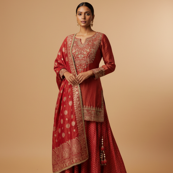 Crafted from Tissue , this lehenga with Sequence work, Zardozi work, Zari work, Pearl work is ideal for Party Wear. Its Lightweight feel ensures both comfort and style. Dry Wash / Dry Clean recommended.