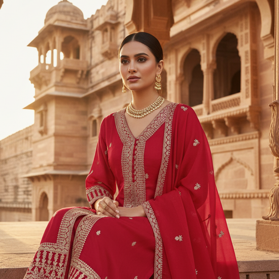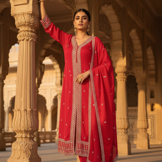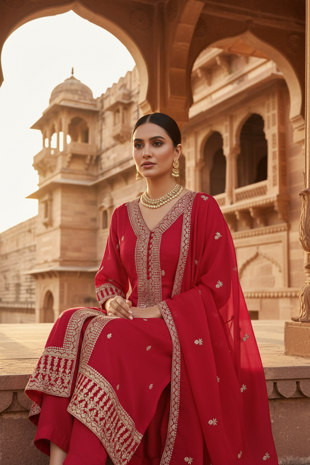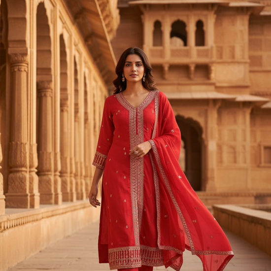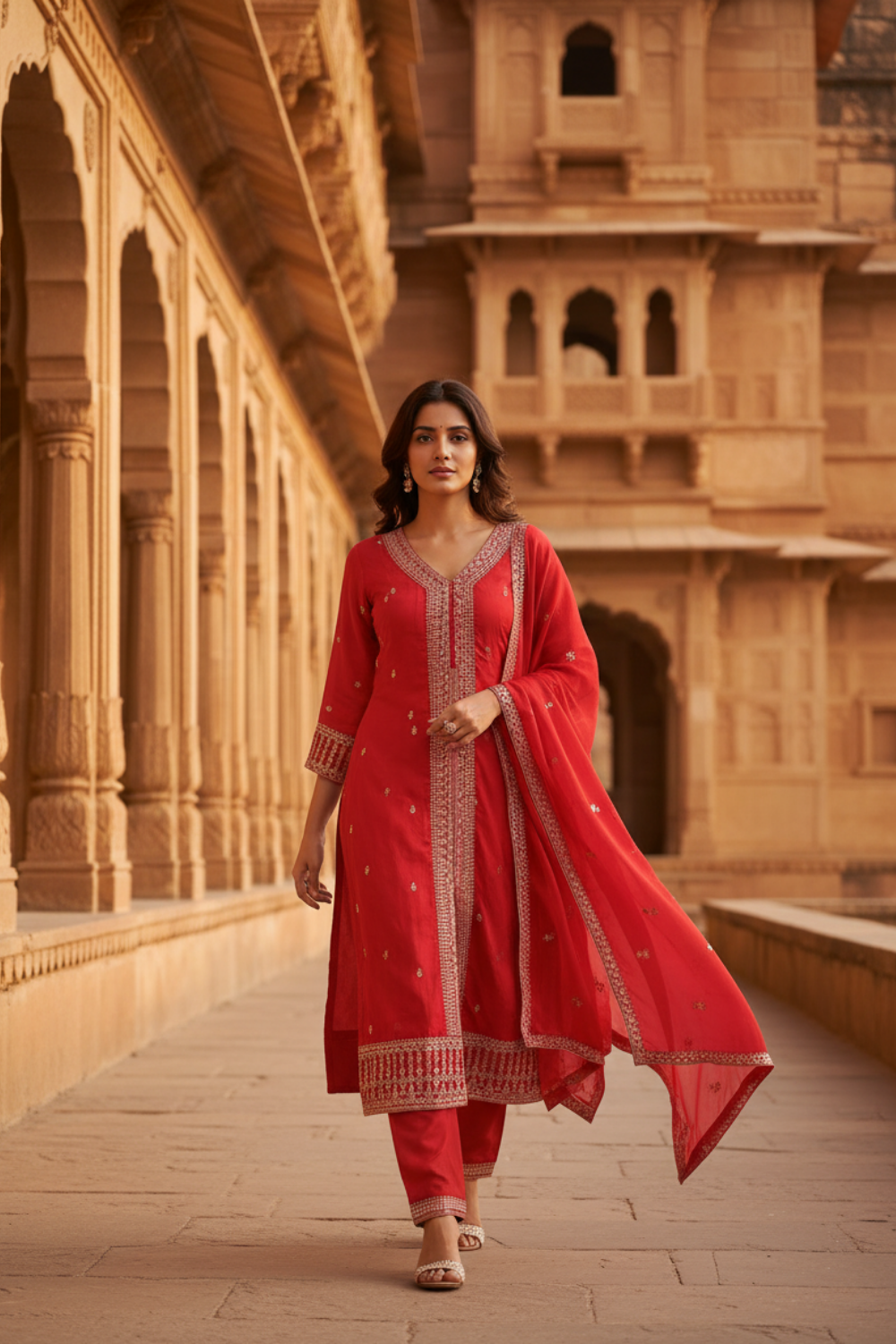 Panna Red Cotton Readymade Suit And Pant With Cotton Dupatta