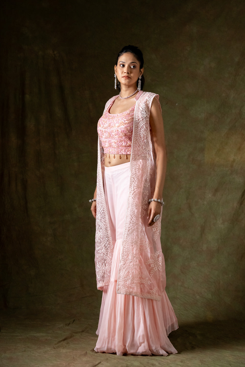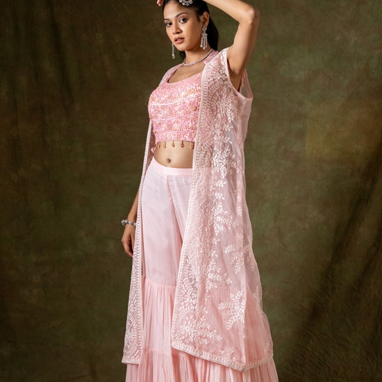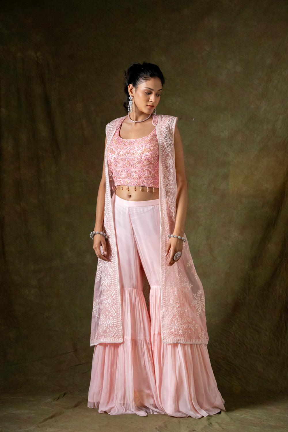 Panna Pink Georgette Short Top Sharara Set With Shrug