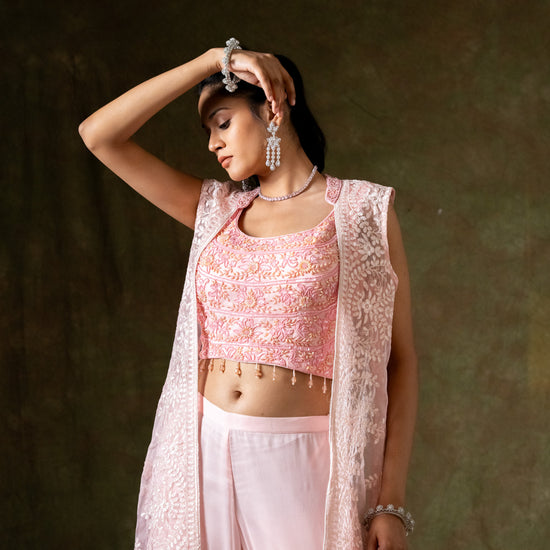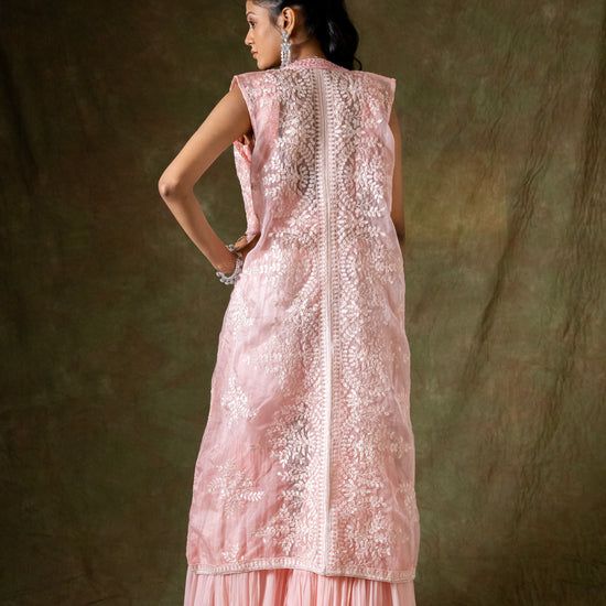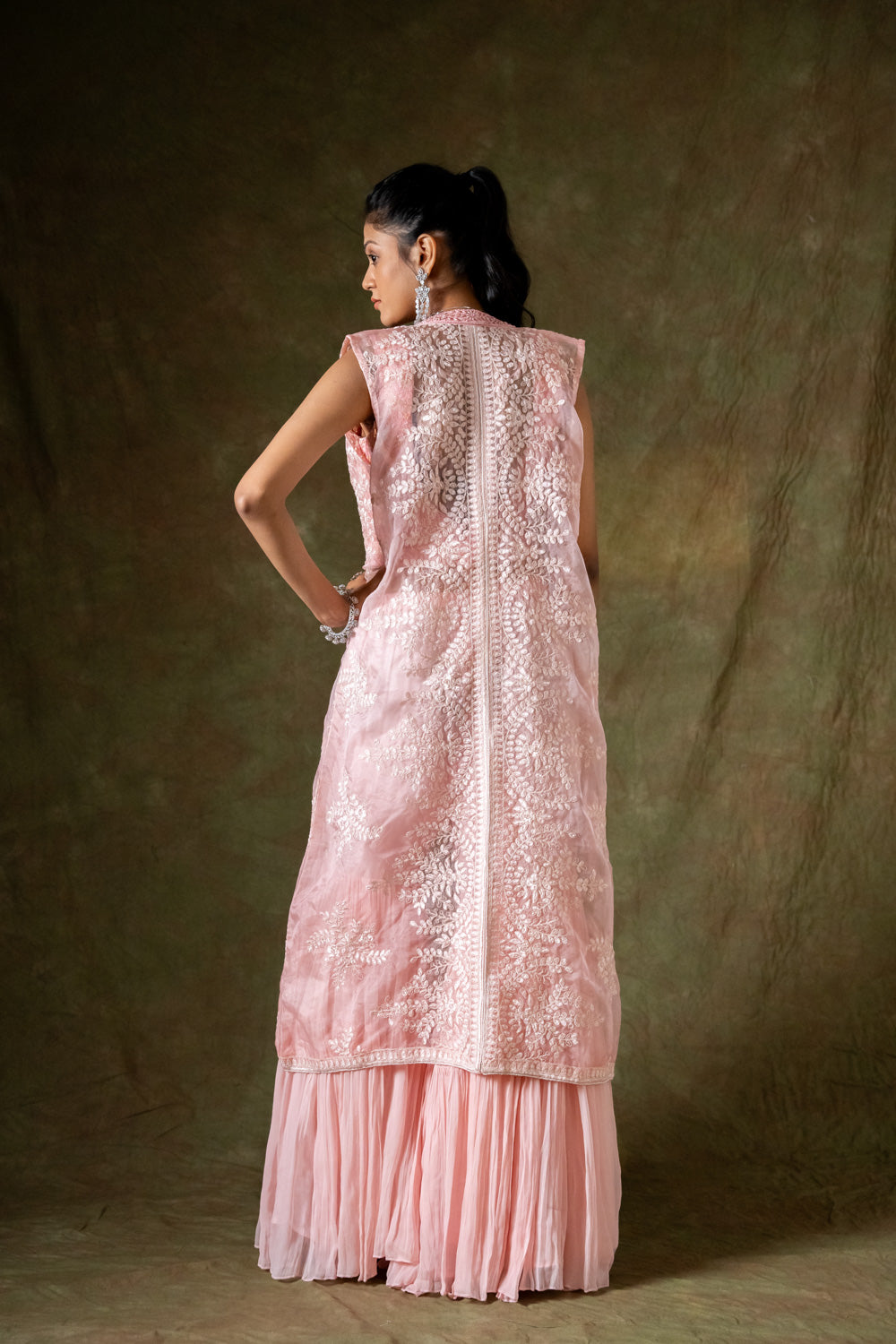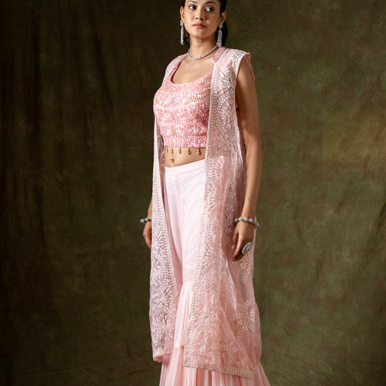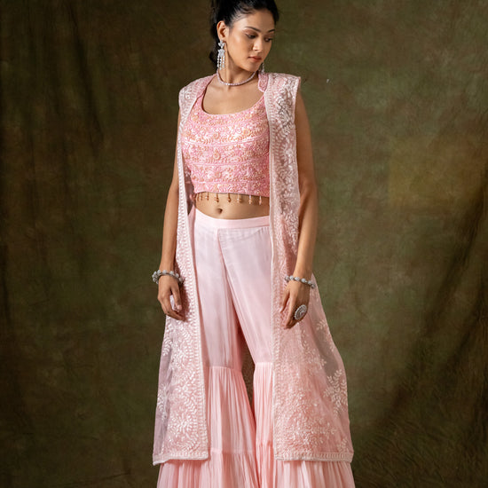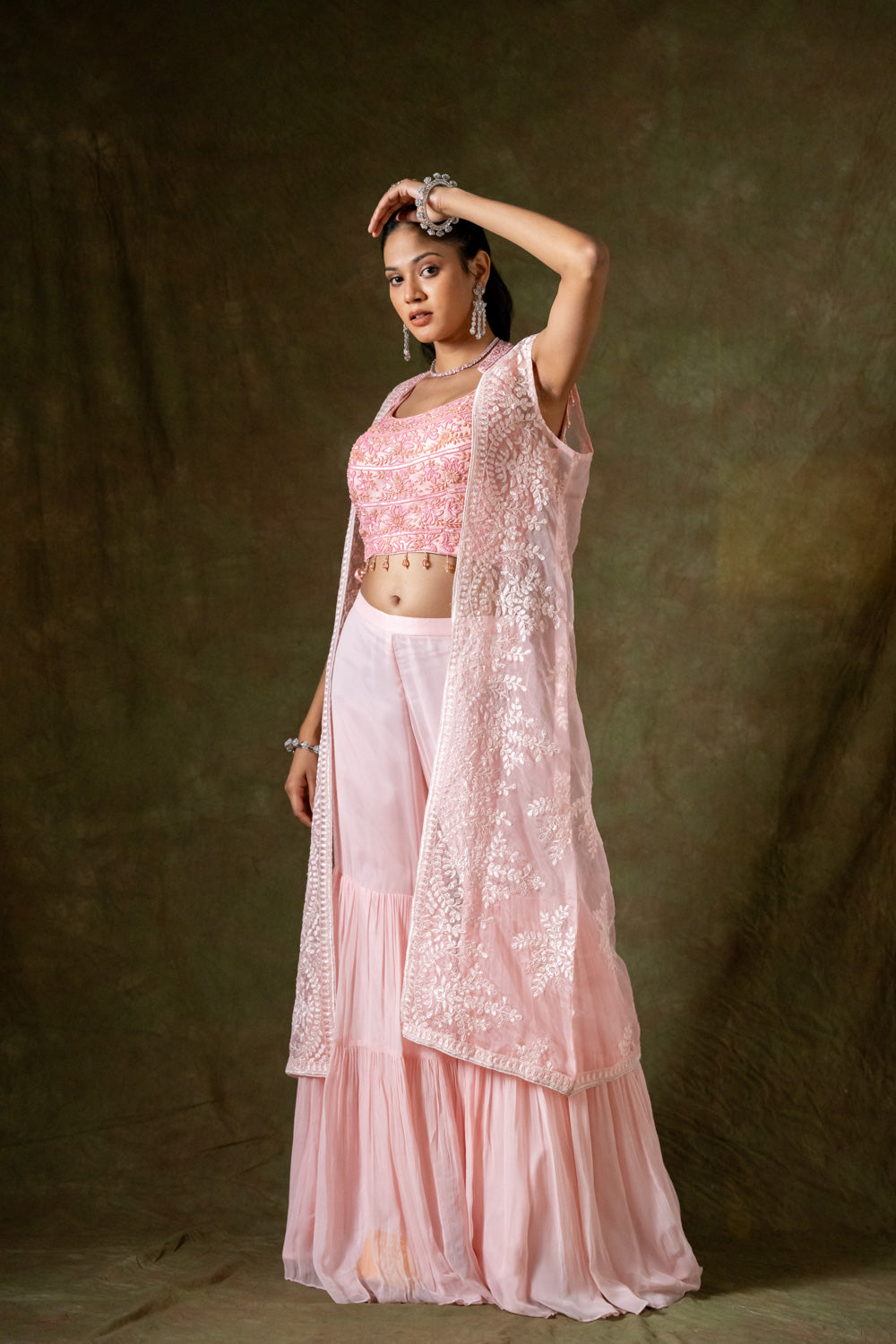 Panna Pink Georgette Short Top Sharara Set With Shrug