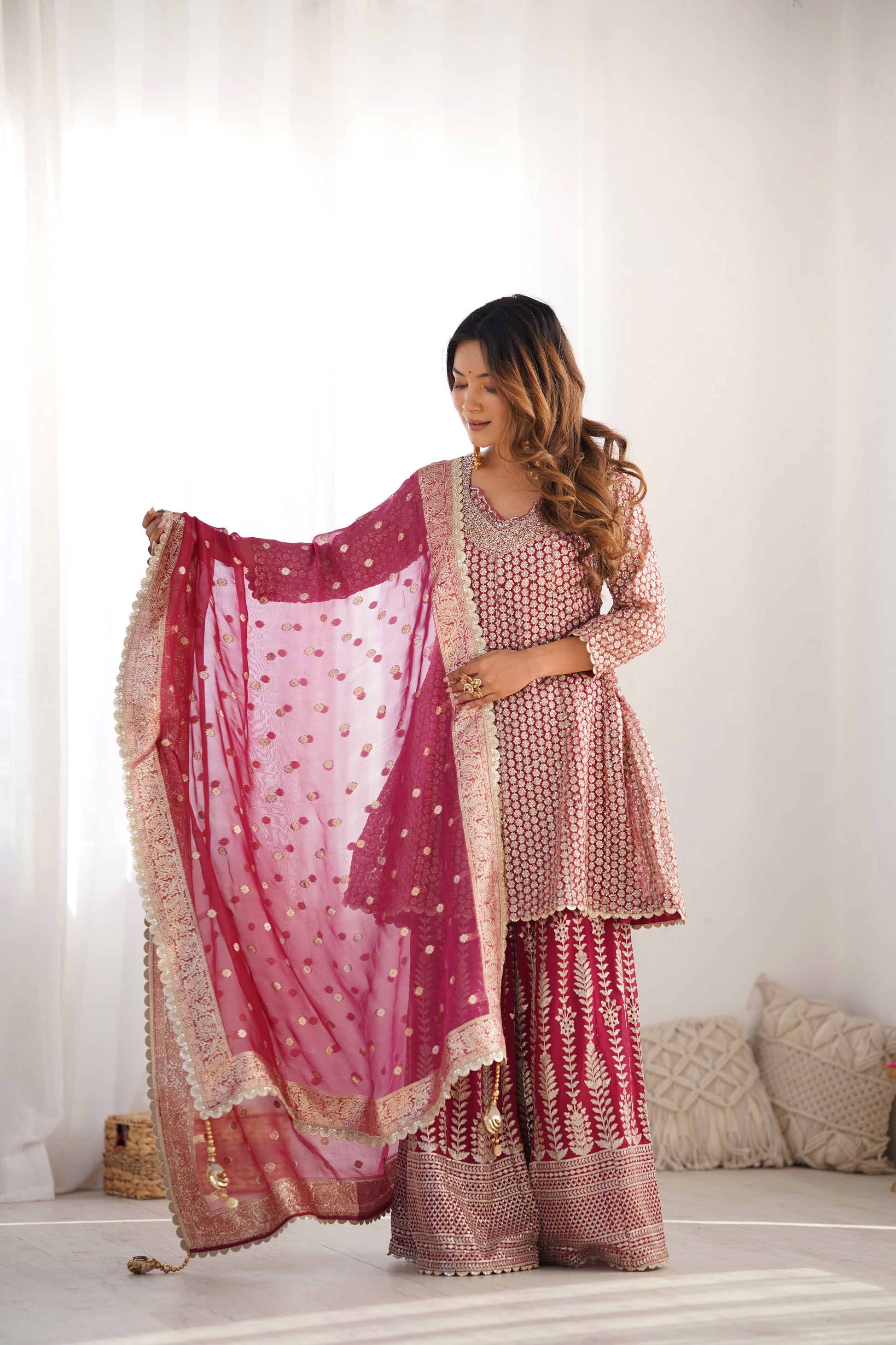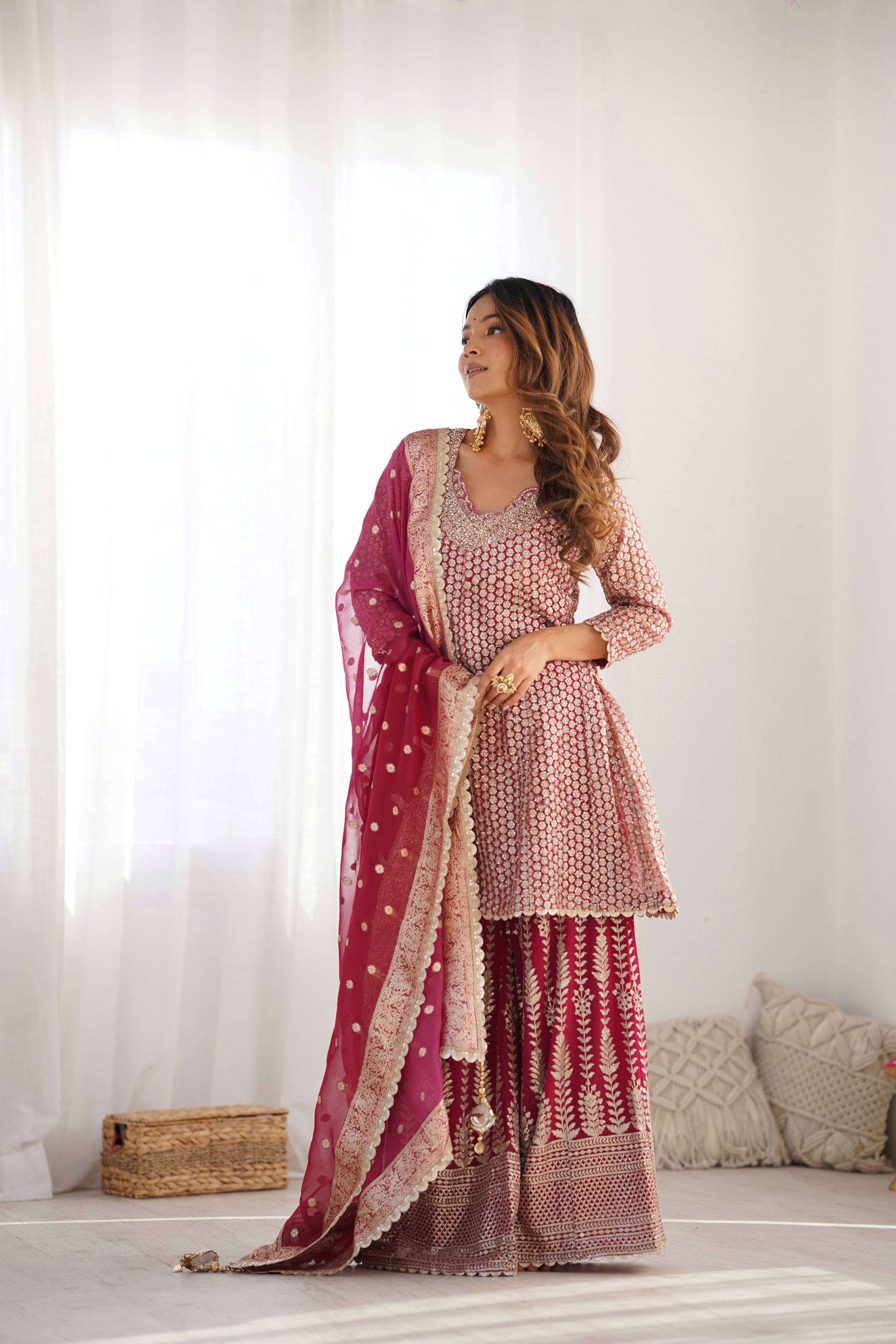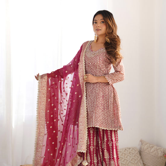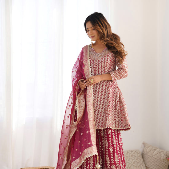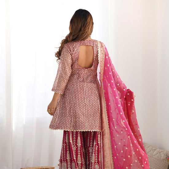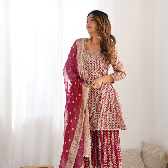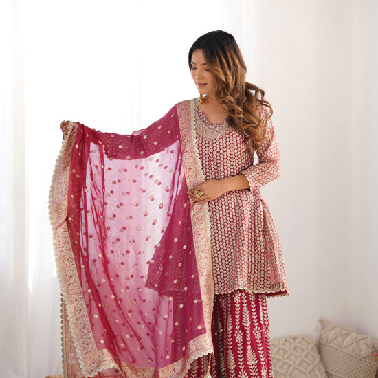Panna Maroon Net Readymade Sharara Set With Organza Dupatta (Ft:-Arti Chauhan)