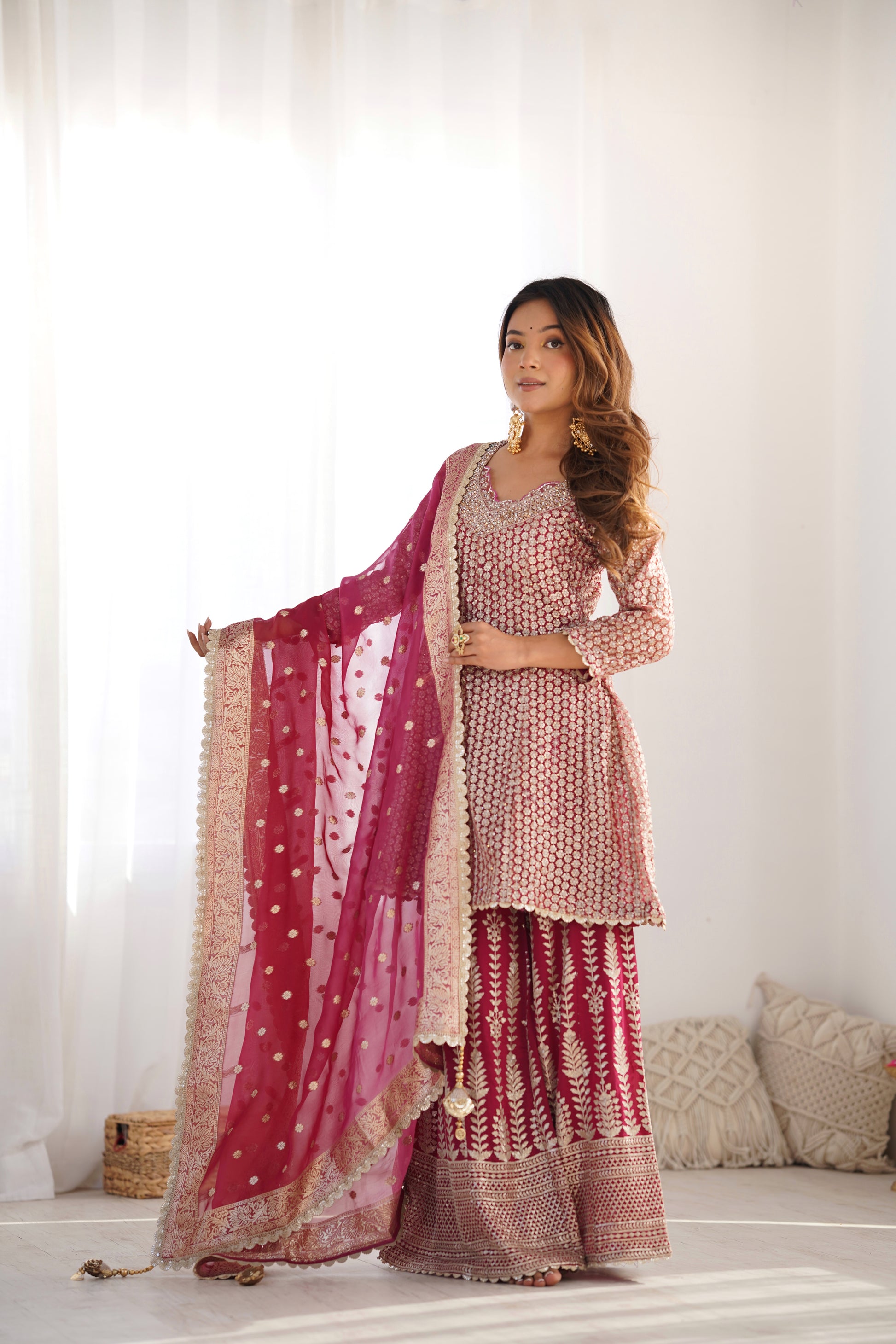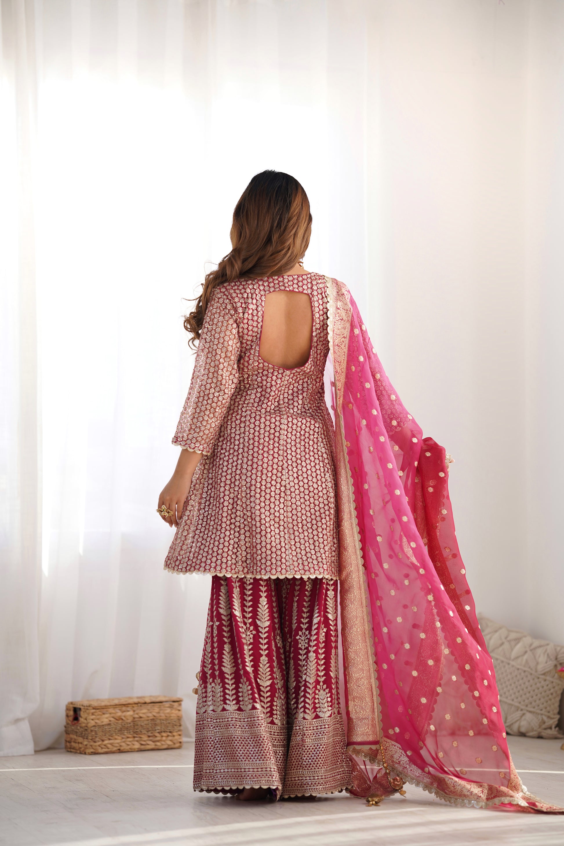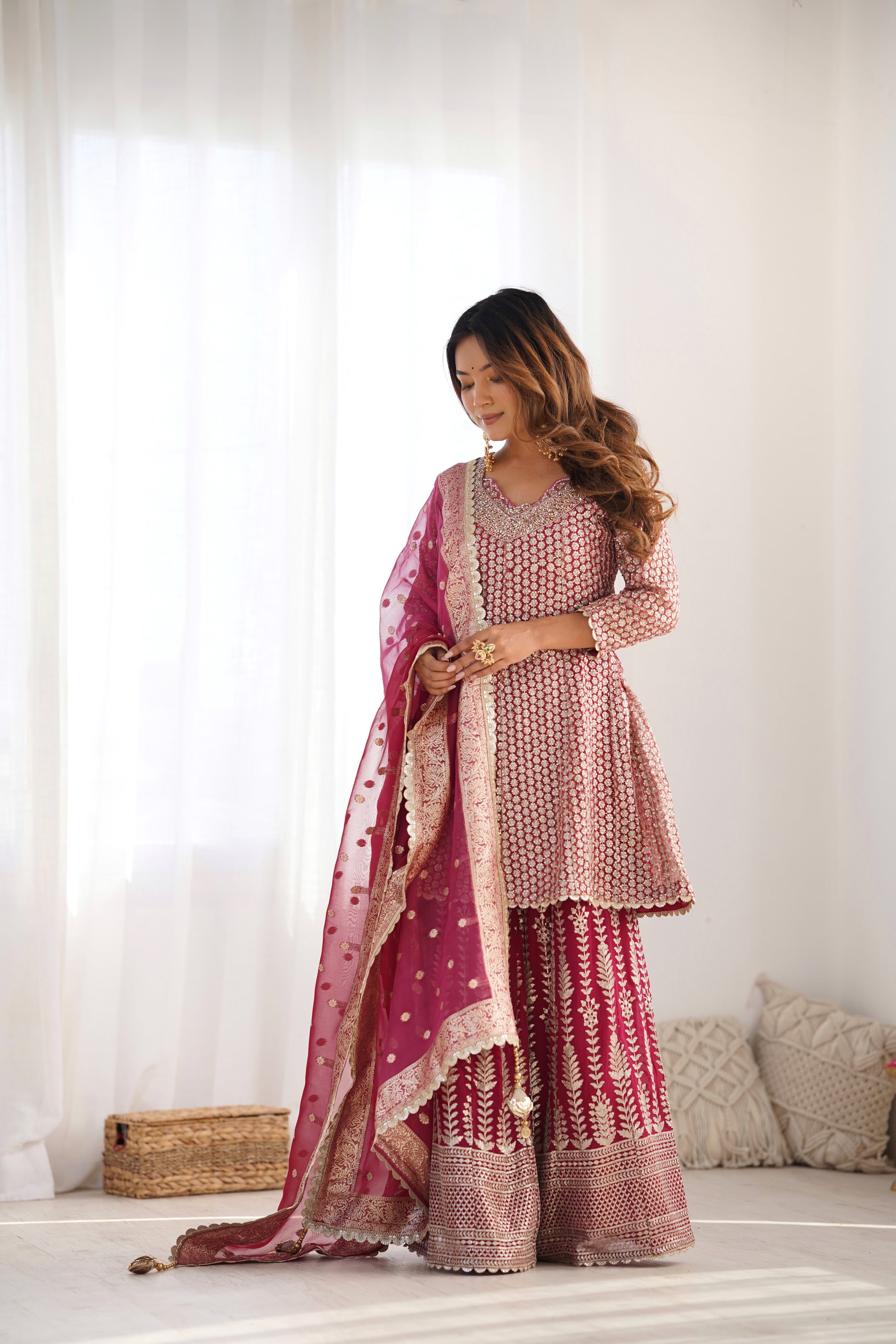 Panna Maroon Net Readymade Sharara Set With Organza Dupatta (Ft:-Arti Chauhan)
