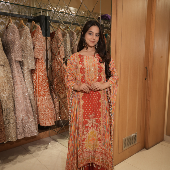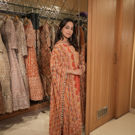 Rust Gotta Patti, Mirror, Sequence & Digital Printed Crepe Readymade Suit With Pant (Ft:-Neha Bijlani & Muskan Sharma)
