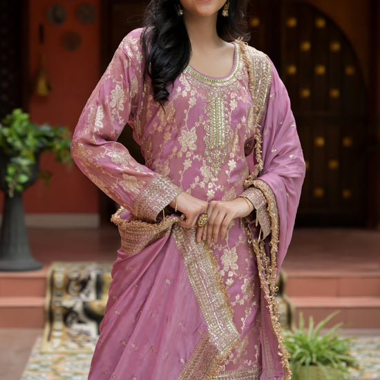 Crafted from Tissue, this ready-made suit features Banarasi Woven Zari, Bead, Cutdana, Dabka, Mirror, Sequence & Zari Threadwork and is perfect for Formal Occasion. Its Heavy design ensures comfort and style. Follow Dry Wash / Dry Clean.