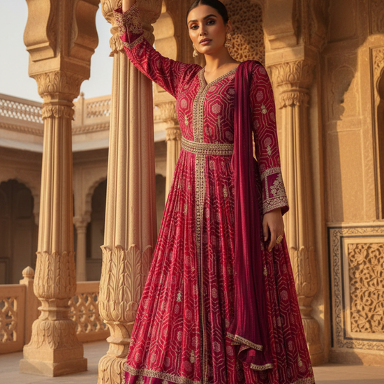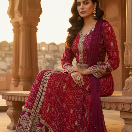 Featuring Bandhini Print, Mirror Sheet, Sequence & Zari Threadwork, this Georgette suit is crafted for Formal Occasion. Its Color Variations and pre-stitching make it a go-to option. Dry Wash / Dry Clean recommended.