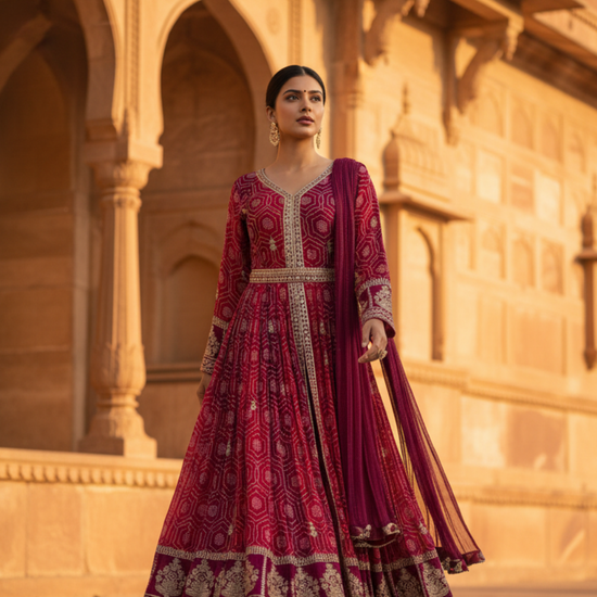 Work : Bandhini Print, Mirror Sheet, Sequence & Zari Threadwork