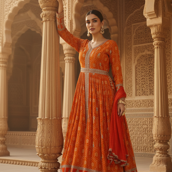 Featuring Bandhini Print, Mirror Sheet, Sequence & Zari Threadwork, this Georgette suit is crafted for Formal Occasion. Its Color Variations and pre-stitching make it a go-to option. Dry Wash / Dry Clean recommended.